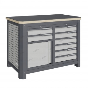 Рама верстака выполнена их холоднокатаной стали. Опоры допускают частичную регулировку по высоте для компенсации неровности пола. Все металлические элементы покрыты полиэфирной порошковой краской, обеспечивающей хорошую износостойкость покрытия и невосприимчивость его к моющим средствам и смазочным веществам. Верстак имеет декларацию соответствия ТР ТС 025/2012 «О безопасности мебельной продукции». Верстак имеет сертификат соответствия ГОСТ Р 58863-2020 «Столы производственные. Верстаки из металла. Общие технические условия». Столешница состоит из листа влагостойкой фанеры марки ФСФ толщиной 40 мм, которая покрыта лаком-антисептиком и листом горячекатаной стали толщиной 5 мм. Глубина столешниц 743 мм. Максимальная масса груза, равномерно распределенного по столешнице, составляет 1500 кг. Модуль верстака выполнен сварными. Ящики в модулях устанавливаются на шариковых телескопических направляющих полного выдвижения. В модуле S6 установлено шесть малых ящиков. Внутренние размеры малых ящиков (ВхШхГ), не более: 75 х 340 х 500 мм. Максимально допустимая масса груза, равномерно распределенного по поверхности любого выдвижного ящика 31 кг. В модуле S9 установлено два малых ящика, дверь и одна полка. Внутренние размеры малого ящика (ВхШхГ), не более: 75 х 340 х 500 мм. Дверь имеет размеры (ВхШхГ), не более: 346 х 367 х 25 мм. Полка модуля имеет размеры (ВхШхГ), не более: 25 х 367 х 510 мм. Максимально допустимая масса груза, равномерно распределенного по поверхности любого выдвижного ящика и полки 31 кг. Модули с ящиками снабжены общим центральным замком с поворотом ригеля 180 градусов и подпружиненной тягой. В комплекте два ключа для каждого замка. Квадратная перфорация на элементах верстака предназначена для установки крючков, держателей и других аксессуаров, имеет размеры: квадрат 12х12мм. шаг 38мм. Характеристики **Габариты и вес товара с упаковкой Общий вес с упаковкой - 0 кг Упаковка Размеры упаковки (Д*Ш*В), мм Вес, кг Упаковка №1 x x 0 ** Теоретический вес