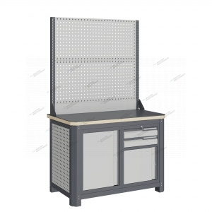 Рама верстака выполнена их холоднокатаной стали. Опоры допускают частичную регулировку по высоте для компенсации неровности пола. Все металлические элементы покрыты полиэфирной порошковой краской, обеспечивающей хорошую износостойкость покрытия и невосприимчивость его к моющим средствам и смазочным веществам. Верстак имеет декларацию соответствия ТР ТС 025/2012 «О безопасности мебельной продукции». Верстак имеет сертификат соответствия ГОСТ Р 58863-2020 «Столы производственные. Верстаки из металла. Общие технические условия». Столешница состоит из листа влагостойкой фанеры марки ФСФ толщиной 40 мм, которая покрыта лаком-антисептиком и листом горячекатаной стали толщиной 5 мм. Глубина столешниц 743 мм. Максимальная масса груза, равномерно распределенного по столешнице, составляет 1500 кг. Модуль верстака выполнен сварными. Ящики в модулях устанавливаются на шариковых телескопических направляющих полного выдвижения. В модуле S7 установлена дверь и две полки. Дверь имеет размеры (ВхШхГ), не более: 578 х 367 х 25 мм. Полка модуля имеет размеры (ВхШхГ), не более: 25 х 367 х 510 мм. Максимально допустимая масса груза, равномерно распределенного по поверхности полки 31 кг. В модуле S9 установлено два малых ящика, дверь и одна полка. Внутренние размеры малого ящика (ВхШхГ), не более: 75 х 340 х 500 мм. Дверь имеет размеры (ВхШхГ), не более: 346 х 367 х 25 мм. Полка модуля имеет размеры (ВхШхГ), не более: 25 х 367 х 510 мм. Максимально допустимая масса груза, равномерно распределенного по поверхности любого выдвижного ящика и полки 31 кг. Модули с ящиками снабжены общим центральным замком с поворотом ригеля 180 градусов и подпружиненной тягой. В комплекте два ключа для каждого замка. Квадратная перфорация на элементах верстака предназначена для установки крючков, держателей и других аксессуаров, имеет размеры: квадрат 12х12мм. шаг 38мм. Экран (перфорированная панель) верстака выполнен с квадратной перфорацией 12х12 мм с шагом 38 мм для установки крючков, держателей и других аксессуаров. Экран крепятся к столешнице с помощью специальных кронштейнов. Максимальная масса груза, равномерно распределенного по поверхности экрана, составляет 71 кг. Характеристики **Габариты и вес товара с упаковкой Общий вес с упаковкой - 0 кг Упаковка Размеры упаковки (Д*Ш*В), мм Вес, кг Упаковка №1 x x 0 ** Теоретический вес
