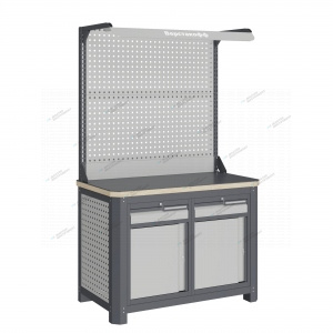 Рама верстака выполнена их холоднокатаной стали. Опоры допускают частичную регулировку по высоте для компенсации неровности пола. Все металлические элементы покрыты полиэфирной порошковой краской, обеспечивающей хорошую износостойкость покрытия и невосприимчивость его к моющим средствам и смазочным веществам. Верстак имеет декларацию соответствия ТР ТС 025/2012 «О безопасности мебельной продукции». Верстак имеет сертификат соответствия ГОСТ Р 58863-2020 «Столы производственные. Верстаки из металла. Общие технические условия». Столешница состоит из листа влагостойкой фанеры марки ФСФ толщиной 40 мм, которая покрыта лаком-антисептиком и листом горячекатаной стали толщиной 5 мм. Глубина столешниц 743 мм. Максимальная масса груза, равномерно распределенного по столешнице, составляет 1500 кг. Модуль верстака выполнен сварными. Ящики в модулях устанавливаются на шариковых телескопических направляющих полного выдвижения. В модуле S8 установлено один малый ящик и дверца. Внутренние размеры малого ящика (ВхШхГ), не более: 75 х 755 х 500 мм. Максимально допустимая масса груза, равномерно распределенного по поверхности полки или по поверхности любого выдвижного ящика - 31 кг. Полка модуля имеет размеры (ВхШхГ), не более: 25 х 367 х 510 мм. Модули с ящиками снабжены общим центральным замком с поворотом ригеля 180 градусов и подпружиненной тягой. В комплекте два ключа для каждого замка. Квадратная перфорация на элементах верстака предназначена для установки крючков, держателей и других аксессуаров, имеет размеры: квадрат 12х12мм. шаг 38мм. Экран (перфорированная панель) верстака выполнен с квадратной перфорацией 12х12 мм с шагом 38 мм для установки крючков, держателей и других аксессуаров. Экран крепятся к столешнице с помощью специальных кронштейнов. Максимальная масса груза, равномерно распределенного по поверхности экрана, составляет 71 кг. Комплект освещения устанавливается над верстаком. В комплекте идет защитный козырек, кронштейны и лампа с магнитными креплениями, которые позволяют менять ее положение. Характеристики **Габариты и вес товара с упаковкой Общий вес с упаковкой - 0 кг Упаковка Размеры упаковки (Д*Ш*В), мм Вес, кг Упаковка №1 x x 0 ** Теоретический вес