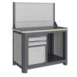 Рама верстака выполнена их холоднокатаной стали. Опоры допускают частичную регулировку по высоте для компенсации неровности пола. Все металлические элементы покрыты полиэфирной порошковой краской, обеспечивающей хорошую износостойкость покрытия и невосприимчивость его к моющим средствам и смазочным веществам. Верстак имеет декларацию соответствия ТР ТС 025/2012 «О безопасности мебельной продукции». Верстак имеет сертификат соответствия ГОСТ Р 58863-2020 «Столы производственные. Верстаки из металла. Общие технические условия». Столешница состоит из листа влагостойкой фанеры марки ФСФ толщиной 40 мм, которая покрыта лаком-антисептиком и листом горячекатаной стали толщиной 5 мм. Глубина столешниц 743 мм. Максимальная масса груза, равномерно распределенного по столешнице, составляет 1500 кг. Модуль верстака выполнен сварными. Ящики в модулях устанавливаются на шариковых телескопических направляющих полного выдвижения. В модуле S9 установлено два малых ящика, дверь и одна полка. Внутренние размеры малого ящика (ВхШхГ), не более: 75 х 340 х 500 мм. Дверь имеет размеры (ВхШхГ), не более: 346 х 367 х 25 мм. Полка модуля имеет размеры (ВхШхГ), не более: 25 х 367 х 510 мм. Максимально допустимая масса груза, равномерно распределенного по поверхности любого выдвижного ящика и полки 31 кг. Комплект полка-стенка SW1. Размеры полки (ВхШхГ), не более: 35 х 415 х 619 мм. Размеры стенки (ВхШхГ), не более: 652 х 415 х 25 мм. Максимально допустимая масса груза, равномерно распределенного по поверхности полки 31 кг. Модули с ящиками снабжены общим центральным замком с поворотом ригеля 180 градусов и подпружиненной тягой. В комплекте два ключа для каждого замка. Квадратная перфорация на элементах верстака предназначена для установки крючков, держателей и других аксессуаров, имеет размеры: квадрат 12х12мм. шаг 38мм. Экран (перфорированная панель) верстака выполнен с квадратной перфорацией 12х12 мм с шагом 38 мм для установки крючков, держателей и других аксессуаров. Экран крепятся к столешнице с помощью специальных кронштейнов. Максимальная масса груза, равномерно распределенного по поверхности экрана, составляет 71 кг. Характеристики **Габариты и вес товара с упаковкой Общий вес с упаковкой - 0 кг Упаковка Размеры упаковки (Д*Ш*В), мм Вес, кг Упаковка №1 x x 0 ** Теоретический вес