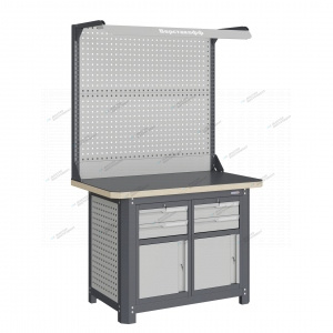 Рама верстака выполнена их холоднокатаной стали. Опоры допускают частичную регулировку по высоте для компенсации неровности пола. Все металлические элементы покрыты полиэфирной порошковой краской, обеспечивающей хорошую износостойкость покрытия и невосприимчивость его к моющим средствам и смазочным веществам. Верстак имеет декларацию соответствия ТР ТС 025/2012 «О безопасности мебельной продукции». Верстак имеет сертификат соответствия ГОСТ Р 58863-2020 «Столы производственные. Верстаки из металла. Общие технические условия». Столешница состоит из листа влагостойкой фанеры марки ФСФ толщиной 40 мм, которая покрыта лаком-антисептиком и листом горячекатаной стали толщиной 5 мм. Глубина столешниц 743 мм. Максимальная масса груза, равномерно распределенного по столешнице, составляет 1500 кг. Модуль верстака выполнен сварными. Ящики в модулях устанавливаются на шариковых телескопических направляющих полного выдвижения. В модуле S9 установлено два малых ящика, дверь и одна полка. Внутренние размеры малого ящика (ВхШхГ), не более: 75 х 340 х 500 мм. Дверь имеет размеры (ВхШхГ), не более: 346 х 367 х 25 мм. Полка модуля имеет размеры (ВхШхГ), не более: 25 х 367 х 510 мм. Максимально допустимая масса груза, равномерно распределенного по поверхности любого выдвижного ящика и полки 31 кг. Модули с ящиками снабжены общим центральным замком с поворотом ригеля 180 градусов и подпружиненной тягой. В комплекте два ключа для каждого замка. Квадратная перфорация на элементах верстака предназначена для установки крючков, держателей и других аксессуаров, имеет размеры: квадрат 12х12мм. шаг 38мм. Экран (перфорированная панель) верстака выполнен с квадратной перфорацией 12х12 мм с шагом 38 мм для установки крючков, держателей и других аксессуаров. Экран крепятся к столешнице с помощью специальных кронштейнов. Максимальная масса груза, равномерно распределенного по поверхности экрана, составляет 71 кг. Комплект освещения устанавливается над верстаком. В комплекте идет защитный козырек, кронштейны и лампа с магнитными креплениями, которые позволяют менять ее положение. Характеристики **Габариты и вес товара с упаковкой Общий вес с упаковкой - 0 кг Упаковка Размеры упаковки (Д*Ш*В), мм Вес, кг Упаковка №1 x x 0 ** Теоретический вес