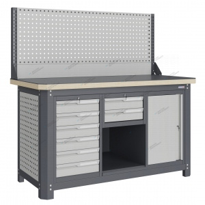 Рама верстака выполнена их холоднокатаной стали. Опоры допускают частичную регулировку по высоте для компенсации неровности пола. Все металлические элементы покрыты полиэфирной порошковой краской, обеспечивающей хорошую износостойкость покрытия и невосприимчивость его к моющим средствам и смазочным веществам. Верстак имеет декларацию соответствия ТР ТС 025/2012 «О безопасности мебельной продукции». Верстак имеет сертификат соответствия ГОСТ Р 58863-2020 «Столы производственные. Верстаки из металла. Общие технические условия». Столешница состоит из листа влагостойкой фанеры марки ФСФ толщиной 40 мм, которая покрыта лаком-антисептиком и листом горячекатаной стали толщиной 5 мм. Глубина столешниц 743 мм. Максимальная масса груза, равномерно распределенного по столешнице, составляет 1500 кг. Модуль верстака выполнен сварными. Ящики в модулях устанавливаются на шариковых телескопических направляющих полного выдвижения. В модуле S6 установлено шесть малых ящиков. Внутренние размеры малых ящиков (ВхШхГ), не более: 75 х 340 х 500 мм. Максимально допустимая масса груза, равномерно распределенного по поверхности любого выдвижного ящика 31 кг. В модуле S7 установлена дверь и две полки. Дверь имеет размеры (ВхШхГ), не более: 578 х 367 х 25 мм. Полка модуля имеет размеры (ВхШхГ), не более: 25 х 367 х 510 мм. Максимально допустимая масса груза, равномерно распределенного по поверхности полки 31 кг. В модуле S2 установлено два малых ящика. Внутренние размеры малых ящиков (ВхШхГ), не более: 75 х 340 х 500 мм. Максимально допустимая масса груза, равномерно распределенного по поверхности любого выдвижного ящика 31 кг. Комплект полка-стенка SW2 установлен под подвесным модулем. Размеры полки (ВхШхГ), не более: 35 х 415 х 619 мм. Размеры стенки (ВхШхГ), не более: 385 х 415 х 25 мм. Максимально допустимая масса груза, равномерно распределенного по поверхности полки 31 кг. Модули с ящиками снабжены общим центральным замком с поворотом ригеля 180 градусов и подпружиненной тягой. В комплекте два ключа для каждого замка. Квадратная перфорация на элементах верстака предназначена для установки крючков, держателей и других аксессуаров, имеет размеры: квадрат 12х12мм. шаг 38мм. Экран (перфорированная панель) верстака выполнен с квадратной перфорацией 12х12 мм с шагом 38 мм для установки крючков, держателей и других аксессуаров. Экран крепятся к столешнице с помощью специальных кронштейнов. Максимальная масса груза, равномерно распределенного по поверхности экрана, составляет 71 кг. Характеристики **Габариты и вес товара с упаковкой Общий вес с упаковкой - 0 кг Упаковка Размеры упаковки (Д*Ш*В), мм Вес, кг Упаковка №1 x x 0 ** Теоретический вес