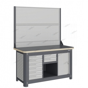 Рама верстака выполнена их холоднокатаной стали. Опоры допускают частичную регулировку по высоте для компенсации неровности пола. Все металлические элементы покрыты полиэфирной порошковой краской, обеспечивающей хорошую износостойкость покрытия и невосприимчивость его к моющим средствам и смазочным веществам. Верстак имеет декларацию соответствия ТР ТС 025/2012 «О безопасности мебельной продукции». Верстак имеет сертификат соответствия ГОСТ Р 58863-2020 «Столы производственные. Верстаки из металла. Общие технические условия». Столешница состоит из листа влагостойкой фанеры марки ФСФ толщиной 40 мм, которая покрыта лаком-антисептиком и листом горячекатаной стали толщиной 5 мм. Глубина столешниц 743 мм. Максимальная масса груза, равномерно распределенного по столешнице, составляет 1500 кг. Модуль верстака выполнен сварными. Ящики в модулях устанавливаются на шариковых телескопических направляющих полного выдвижения. В модуле S6 установлено шесть малых ящиков. Внутренние размеры малых ящиков (ВхШхГ), не более: 75 х 340 х 500 мм. Максимально допустимая масса груза, равномерно распределенного по поверхности любого выдвижного ящика 31 кг. В модуле S7 установлена дверь и две полки. Дверь имеет размеры (ВхШхГ), не более: 578 х 367 х 25 мм. Полка модуля имеет размеры (ВхШхГ), не более: 25 х 367 х 510 мм. Максимально допустимая масса груза, равномерно распределенного по поверхности полки 31 кг. В модуле S2 установлено два малых ящика. Внутренние размеры малых ящиков (ВхШхГ), не более: 75 х 340 х 500 мм. Максимально допустимая масса груза, равномерно распределенного по поверхности любого выдвижного ящика 31 кг. Комплект полка-стенка SW2 установлен под подвесным модулем. Размеры полки (ВхШхГ), не более: 35 х 415 х 619 мм. Размеры стенки (ВхШхГ), не более: 385 х 415 х 25 мм. Максимально допустимая масса груза, равномерно распределенного по поверхности полки 31 кг. Модули с ящиками снабжены общим центральным замком с поворотом ригеля 180 градусов и подпружиненной тягой. В комплекте два ключа для каждого замка. Квадратная перфорация на элементах верстака предназначена для установки крючков, держателей и других аксессуаров, имеет размеры: квадрат 12х12мм. шаг 38мм. Экран (перфорированная панель) верстака выполнен с квадратной перфорацией 12х12 мм с шагом 38 мм для установки крючков, держателей и других аксессуаров. Экран крепятся к столешнице с помощью специальных кронштейнов. Максимальная масса груза, равномерно распределенного по поверхности экрана, составляет 71 кг. Характеристики **Габариты и вес товара с упаковкой Общий вес с упаковкой - 0 кг Упаковка Размеры упаковки (Д*Ш*В), мм Вес, кг Упаковка №1 x x 0 ** Теоретический вес