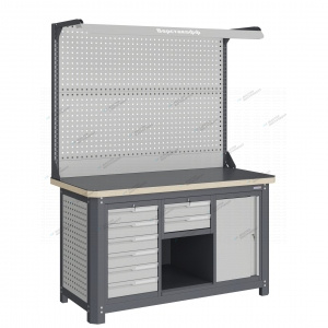 Рама верстака выполнена их холоднокатаной стали. Опоры допускают частичную регулировку по высоте для компенсации неровности пола. Все металлические элементы покрыты полиэфирной порошковой краской, обеспечивающей хорошую износостойкость покрытия и невосприимчивость его к моющим средствам и смазочным веществам. Верстак имеет декларацию соответствия ТР ТС 025/2012 «О безопасности мебельной продукции». Верстак имеет сертификат соответствия ГОСТ Р 58863-2020 «Столы производственные. Верстаки из металла. Общие технические условия». Столешница состоит из листа влагостойкой фанеры марки ФСФ толщиной 40 мм, которая покрыта лаком-антисептиком и листом горячекатаной стали толщиной 5 мм. Глубина столешниц 743 мм. Максимальная масса груза, равномерно распределенного по столешнице, составляет 1500 кг. Модуль верстака выполнен сварными. Ящики в модулях устанавливаются на шариковых телескопических направляющих полного выдвижения. В модуле S6 установлено шесть малых ящиков. Внутренние размеры малых ящиков (ВхШхГ), не более: 75 х 340 х 500 мм. Максимально допустимая масса груза, равномерно распределенного по поверхности любого выдвижного ящика 31 кг. В модуле S7 установлена дверь и две полки. Дверь имеет размеры (ВхШхГ), не более: 578 х 367 х 25 мм. Полка модуля имеет размеры (ВхШхГ), не более: 25 х 367 х 510 мм. Максимально допустимая масса груза, равномерно распределенного по поверхности полки 31 кг. В модуле S2 установлено два малых ящика. Внутренние размеры малых ящиков (ВхШхГ), не более: 75 х 340 х 500 мм. Максимально допустимая масса груза, равномерно распределенного по поверхности любого выдвижного ящика 31 кг. Комплект полка-стенка SW2 установлен под подвесным модулем. Размеры полки (ВхШхГ), не более: 35 х 415 х 619 мм. Размеры стенки (ВхШхГ), не более: 385 х 415 х 25 мм. Максимально допустимая масса груза, равномерно распределенного по поверхности полки 31 кг. Модули с ящиками снабжены общим центральным замком с поворотом ригеля 180 градусов и подпружиненной тягой. В комплекте два ключа для каждого замка. Квадратная перфорация на элементах верстака предназначена для установки крючков, держателей и других аксессуаров, имеет размеры: квадрат 12х12мм. шаг 38мм. Экран (перфорированная панель) верстака выполнен с квадратной перфорацией 12х12 мм с шагом 38 мм для установки крючков, держателей и других аксессуаров. Экран крепятся к столешнице с помощью специальных кронштейнов. Максимальная масса груза, равномерно распределенного по поверхности экрана, составляет 71 кг. Комплект освещения устанавливается над верстаком. В комплекте идет защитный козырек, кронштейны и лампа с магнитными креплениями, которые позволяют менять ее положение. Характеристики **Габариты и вес товара с упаковкой Общий вес с упаковкой - 0 кг Упаковка Размеры упаковки (Д*Ш*В), мм Вес, кг Упаковка №1 x x 0 ** Теоретический вес