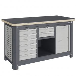 Рама верстака выполнена их холоднокатаной стали. Опоры допускают частичную регулировку по высоте для компенсации неровности пола. Все металлические элементы покрыты полиэфирной порошковой краской, обеспечивающей хорошую износостойкость покрытия и невосприимчивость его к моющим средствам и смазочным веществам. Верстак имеет декларацию соответствия ТР ТС 025/2012 «О безопасности мебельной продукции». Верстак имеет сертификат соответствия ГОСТ Р 58863-2020 «Столы производственные. Верстаки из металла. Общие технические условия». Столешница состоит из листа влагостойкой фанеры марки ФСФ толщиной 40 мм, которая покрыта лаком-антисептиком и листом горячекатаной стали толщиной 5 мм. Глубина столешниц 743 мм. Максимальная масса груза, равномерно распределенного по столешнице, составляет 1500 кг. Модуль верстака выполнен сварными. Ящики в модулях устанавливаются на шариковых телескопических направляющих полного выдвижения. В модуле S6 установлено шесть малых ящиков. Внутренние размеры малых ящиков (ВхШхГ), не более: 75 х 340 х 500 мм. Максимально допустимая масса груза, равномерно распределенного по поверхности любого выдвижного ящика 31 кг. В модуле S7 установлена дверь и две полки. Дверь имеет размеры (ВхШхГ), не более: 578 х 367 х 25 мм. Полка модуля имеет размеры (ВхШхГ), не более: 25 х 367 х 510 мм. Максимально допустимая масса груза, равномерно распределенного по поверхности полки 31 кг. В модуле S2 установлено два малых ящика. Внутренние размеры малых ящиков (ВхШхГ), не более: 75 х 340 х 500 мм. Максимально допустимая масса груза, равномерно распределенного по поверхности любого выдвижного ящика 31 кг. Комплект полка-стенка SW2 установлен под подвесным модулем. Размеры полки (ВхШхГ), не более: 35 х 415 х 619 мм. Размеры стенки (ВхШхГ), не более: 385 х 415 х 25 мм. Максимально допустимая масса груза, равномерно распределенного по поверхности полки 31 кг. Модули с ящиками снабжены общим центральным замком с поворотом ригеля 180 градусов и подпружиненной тягой. В комплекте два ключа для каждого замка. Квадратная перфорация на элементах верстака предназначена для установки крючков, держателей и других аксессуаров, имеет размеры: квадрат 12х12мм. шаг 38мм. Характеристики **Габариты и вес товара с упаковкой Общий вес с упаковкой - 0 кг Упаковка Размеры упаковки (Д*Ш*В), мм Вес, кг Упаковка №1 x x 0 ** Теоретический вес