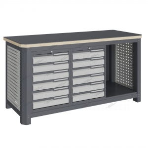 Рама верстака выполнена их холоднокатаной стали. Опоры допускают частичную регулировку по высоте для компенсации неровности пола. Все металлические элементы покрыты полиэфирной порошковой краской, обеспечивающей хорошую износостойкость покрытия и невосприимчивость его к моющим средствам и смазочным веществам. Верстак имеет декларацию соответствия ТР ТС 025/2012 «О безопасности мебельной продукции». Верстак имеет сертификат соответствия ГОСТ Р 58863-2020 «Столы производственные. Верстаки из металла. Общие технические условия». Столешница состоит из листа влагостойкой фанеры марки ФСФ толщиной 40 мм, которая покрыта лаком-антисептиком и листом горячекатаной стали толщиной 5 мм. Глубина столешниц 743 мм. Максимальная масса груза, равномерно распределенного по столешнице, составляет 1500 кг. Модуль верстака выполнен сварными. Ящики в модулях устанавливаются на шариковых телескопических направляющих полного выдвижения. В модуле S6 установлено шесть малых ящиков. Внутренние размеры малых ящиков (ВхШхГ), не более: 75 х 340 х 500 мм. Максимально допустимая масса груза, равномерно распределенного по поверхности любого выдвижного ящика 31 кг. Комплект полка-стенка SW1. Размеры полки (ВхШхГ), не более: 35 х 415 х 619 мм. Размеры стенки (ВхШхГ), не более: 652 х 415 х 25 мм. Максимально допустимая масса груза, равномерно распределенного по поверхности полки 31 кг. Модули с ящиками снабжены общим центральным замком с поворотом ригеля 180 градусов и подпружиненной тягой. В комплекте два ключа для каждого замка. Квадратная перфорация на элементах верстака предназначена для установки крючков, держателей и других аксессуаров, имеет размеры: квадрат 12х12мм. шаг 38мм. Характеристики **Габариты и вес товара с упаковкой Общий вес с упаковкой - 0 кг Упаковка Размеры упаковки (Д*Ш*В), мм Вес, кг Упаковка №1 x x 0 ** Теоретический вес