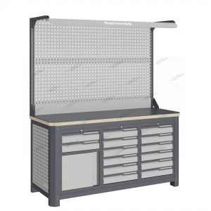 Верстак серии MECHANIC: MCN 1552.S69.1 состоит из столешницы шириной 1493 мм, рамы верстака, состоящей из опор, перемычек, боковых перфопанелей, малых модулей S6 и S9, комплекта полка-стенка SW1. Предназначен для выполнения сборочных, ремонтных, слесарных, монтажных и других видов работ на производстве, в сервисных центрах, мастерских, гаражах. Рама верстака выполнена их холоднокатаной стали. Опоры допускают частичную регулировку по высоте для компенсации неровности пола. Все металлические элементы покрыты полиэфирной порошковой краской, обеспечивающей хорошую износостойкость покрытия и невосприимчивость его к моющим средствам и смазочным веществам. Верстак имеет декларацию соответствия ТР ТС 025/2012 «О безопасности мебельной продукции». Верстак имеет сертификат соответствия ГОСТ Р 58863-2020 «Столы производственные. Верстаки из металла. Общие технические условия». Столешница состоит из листа влагостойкой фанеры марки ФСФ толщиной 40 мм, которая покрыта лаком-антисептиком и листом горячекатаной стали толщиной 5 мм. Глубина столешниц 743 мм. Максимальная масса груза, равномерно распределенного по столешнице, составляет 1500 кг. Модуль верстака выполнен сварными. Ящики в модулях устанавливаются на шариковых телескопических направляющих полного выдвижения. В модуле S6 установлено шесть малых ящиков. Внутренние размеры малых ящиков (ВхШхГ), не более: 75 х 340 х 500 мм. Максимально допустимая масса груза, равномерно распределенного по поверхности любого выдвижного ящика 31 кг. В модуле S9 установлено два малых ящика, дверь и одна полка. Внутренние размеры малого ящика (ВхШхГ), не более: 75 х 340 х 500 мм. Дверь имеет размеры (ВхШхГ), не более: 346 х 367 х 25 мм. Полка модуля имеет размеры (ВхШхГ), не более: 25 х 367 х 510 мм. Максимально допустимая масса груза, равномерно распределенного по поверхности любого выдвижного ящика и полки 31 кг. Комплект полка-стенка SW1. Размеры полки (ВхШхГ), не более: 35 х 415 х 619 мм. Размеры стенки (ВхШхГ), не более: 652 х 415 х 25 мм. Максимально допустимая масса груза, равномерно распределенного по поверхности полки 31 кг. Модули с ящиками снабжены общим центральным замком с поворотом ригеля 180 градусов и подпружиненной тягой. В комплекте два ключа для каждого замка. Квадратная перфорация на элементах верстака предназначена для установки крючков, держателей и других аксессуаров, имеет размеры: квадрат 12х12мм. шаг 38мм. Характеристики **Габариты и вес товара с упаковкой Общий вес с упаковкой - 0 кг Упаковка Размеры упаковки (Д*Ш*В), мм Вес, кг Упаковка №1 x x 0 ** Теоретический вес