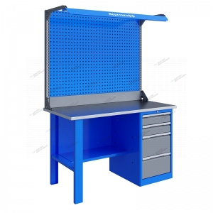 Верстак серии Technic 141.14.2-2F состоит из столешницы шириной 1396 мм, опоры, тумбы P4 с двумя малыми и двумя большими ящиками, полки-стенки, двойного экрана с кронштейнами и комплекта освещения. Предназначен для выполнения сборочных, ремонтных, слесарных, монтажных и других видов работ на производстве, в сервисных центрах, мастерских, гаражах, а также для обучения технологии в учебных заведениях. Верстак представляет собой сборно-разборную конструкцию. Опорные элементы выполнены сварными из холоднокатаной стали. Верстак комплектуется полкой-стенкой, расположенной под столешницей для удобного размещения габаритного инструмента и оснастки. Все металлические элементы покрыты полиэфирной порошковой краской, обеспечивающей хорошую износостойкость покрытия и невосприимчивость его к моющим средствам и смазочным веществам. Цвет и текстура покрытия корпуса тумб, опор, полки-стенки, экранов и комплектов освещения RAL 5015, гладкая, полуматовая. Цвет и текстура покрытия ящиков и дверок верстака, кронштейнов экранов и косынок RAL 7037, гладкая, глянцевая. Цвет и текстура покрытия накладок ручек ящиков и дверок RAL 9006, гладкая, глянцевая. Столешница состоит из листа влагостойкой фанеры марки ФСФ толщиной 24 мм, которая покрыта лаком-антисептиком и листом оцинкованной холоднокатаной стали толщиной 1,2 мм. Глубина столешниц 696 мм. Максимальная масса груза, равномерно распределенного по столешнице - 750 кг. Тумба верстака - сварная. Ящики в тумбе устанавливаются на шариковых телескопических направляющих полного выдвижения. В тумбе P4 установлено два малых и два больших ящика. Внутренние размеры малых ящиков (ВхШхГ), не более: 103 х 397 х 520 мм. Внутренние размеры больших ящиков (ВхШхГ), не более: 222 х 397 х 520 мм. Тумбы с ящиками снабжены общим центральным замком с поворотом ригеля 180 градусов и подпружиненной тягой. В комплекте два ключа. Максимально допустимая масса груза, равномерно распределенного по поверхности любого выдвижного ящика 30 кг (при установке в большой ящик двух пар направляющих 50 кг). Максимальная масса груза, распределенного по поверхности полки и полки стенки, составляет 30 кг. Верстак имеет декларацию соответствия ТР ТС 025/2012 «О безопасности мебельной продукции». Верстак имеет сертификат соответствия ГОСТ Р 58863-2020 «Столы производственные. Верстаки из металла. Общие технические условия». Двойной экран (перфорированные панели) верстака выполнен с квадратной перфорацией 12х12 мм с шагом 38 мм для установки крючков, держателей и других аксессуаров. Экран крепится к столешнице с помощью специальных кронштейнов. Максимальная масса груза, равномерно распределенного по поверхности экрана, составляет 21 кг. Комплект освещения устанавливается над верстаком. В комплекте: защитный козырек, кронштейны и лампа с магнитными креплениями, которые позволяют менять ее положение. Комплектация Столешница PTT141 (14.696.24.1) Опора P1 – 1 шт. Тумба P4 – 1 шт. Полка-стенка PSW2 (14-18.700) – 1 шт. Кронштейн PKL (2.1110) – 2 шт. Косынка кронштейна KCL – 2 шт. Панель пустая BP (14.1302) – 1 шт. Перфопанель QTPL (14.1302) – 1 шт. Комплект освещения FB (14.1364) – 1 шт. Характеристики **Габариты и вес товара с упаковкой Общий вес с упаковкой - 0 кг Упаковка Размеры упаковки (Д*Ш*В), мм Вес, кг Упаковка №1 x x 0 ** Теоретический вес
