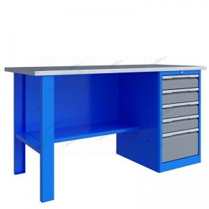 Верстак серии Technic 161.15.3 состоит из столешницы шириной 1596 мм, опоры, тумбы P5 с четырьмя малыми и одним большим ящиком и полки-стенки. Предназначен для выполнения сборочных, ремонтных, слесарных, монтажных и других видов работ на производстве, в сервисных центрах, мастерских, гаражах, а также для обучения технологии в учебных заведениях. Верстак представляет собой сборно-разборную конструкцию. Опорные элементы выполнены сварными из холоднокатаной стали. Верстак комплектуется полкой-стенкой, расположенной под столешницей для удобного размещения габаритного инструмента и оснастки. Все металлические элементы покрыты полиэфирной порошковой краской, обеспечивающей хорошую износостойкость покрытия и невосприимчивость его к моющим средствам и смазочным веществам. Цвет и текстура покрытия корпуса тумб, опор, полки-стенки, экранов и комплектов освещения RAL 5015, гладкая, полуматовая. Цвет и текстура покрытия ящиков и дверок верстака, кронштейнов экранов и косынок RAL 7037, гладкая, глянцевая. Цвет и текстура покрытия накладок ручек ящиков и дверок RAL 9006, гладкая, глянцевая. Столешница состоит из листа влагостойкой фанеры марки ФСФ толщиной 24 мм, которая покрыта лаком-антисептиком и листом оцинкованной холоднокатаной стали толщиной 1,2 мм. Глубина столешниц 696 мм. Максимальная масса груза, равномерно распределенного по столешнице - 750 кг. Тумба верстака - сварная. Ящики в тумбе устанавливаются на шариковых телескопических направляющих полного выдвижения. В тумбе P5 установлено четыре малых и один большой ящика. Внутренние размеры малых ящиков (ВхШхГ), не более: 103 х 397 х 520 мм. Внутренние размеры больших ящиков (ВхШхГ), не более: 222 х 397 х 520 мм. Тумбы с ящиками снабжены общим центральным замком с поворотом ригеля 180 градусов и подпружиненной тягой. В комплекте два ключа. Максимально допустимая масса груза, равномерно распределенного по поверхности любого выдвижного ящика 30 кг (при установке в большой ящик двух пар направляющих 50 кг). Максимальная масса груза, распределенного по поверхности полки и полки стенки, составляет 30 кг. Верстак имеет декларацию соответствия ТР ТС 025/2012 «О безопасности мебельной продукции». Верстак имеет сертификат соответствия ГОСТ Р 58863-2020 «Столы производственные. Верстаки из металла. Общие технические условия». Комплектация Столешница PTT161 (16.696.24.1) Опора P1 – 1 шт. Тумба P5 – 1 шт. Полка-стенка PSW3 (16-12.900) – 1 шт. Характеристики **Габариты и вес товара с упаковкой Общий вес с упаковкой - 0 кг Упаковка Размеры упаковки (Д*Ш*В), мм Вес, кг Упаковка №1 x x 0 ** Теоретический вес