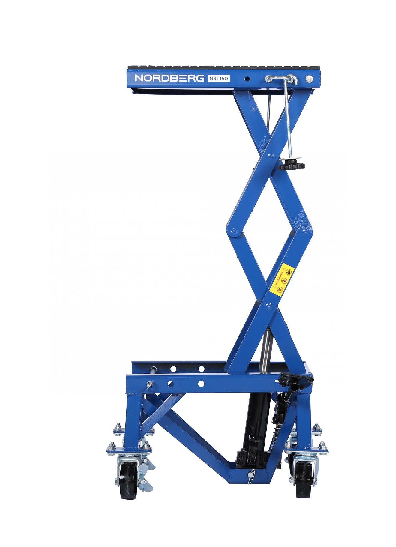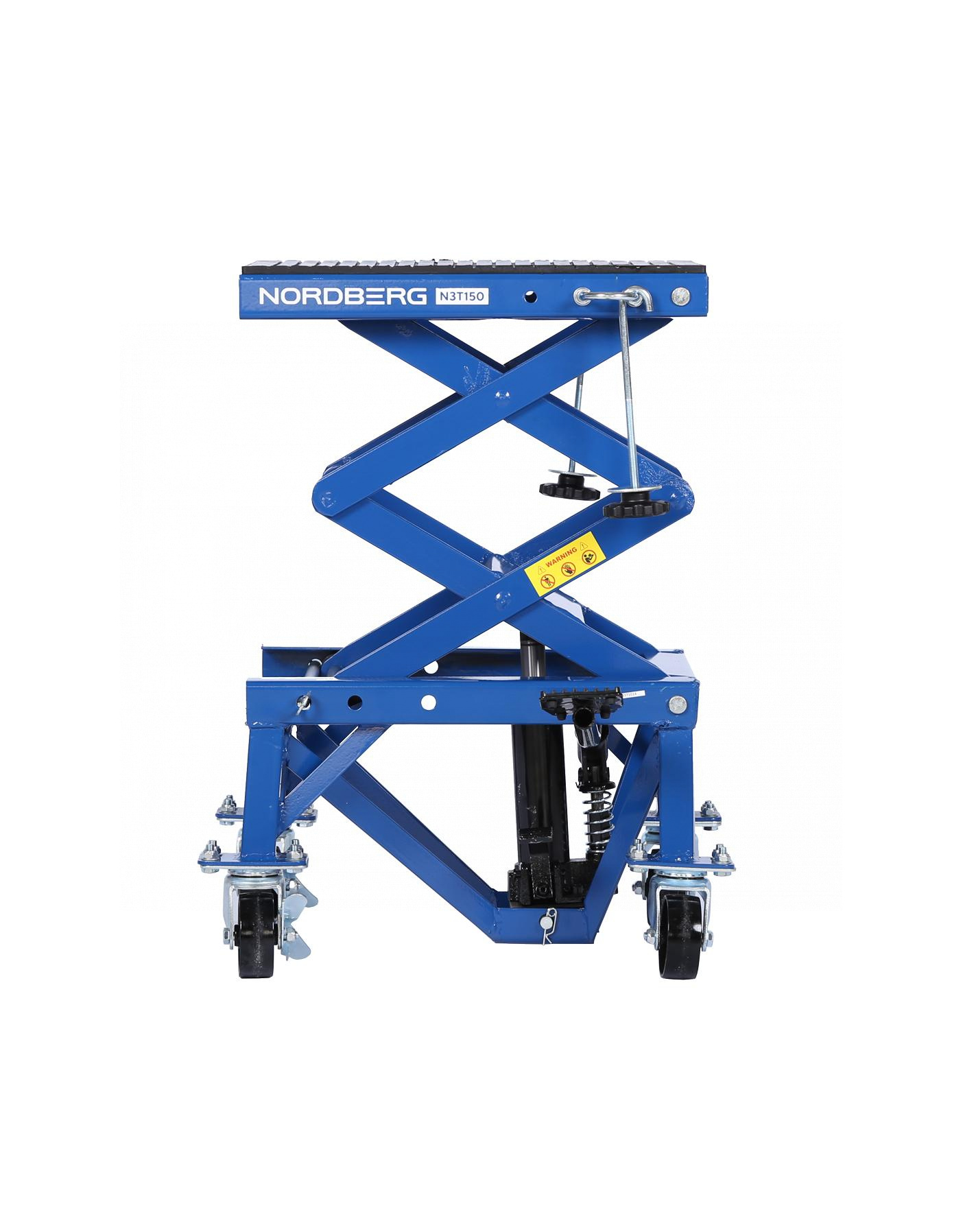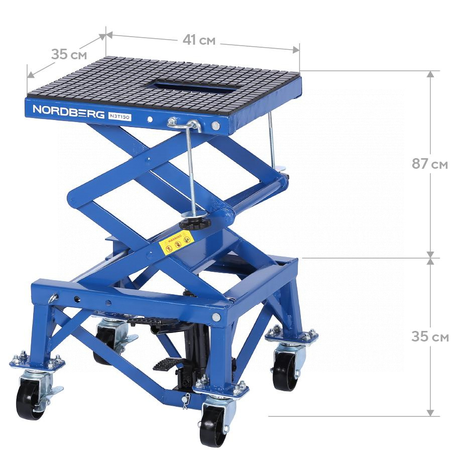 О товаре NORDBERG N3T150 — профессиональный подкатной мотоподъёмник. Применяется в мастерских, СТО и гаражах. ФУНКЦИОНАЛ Платформенный подъёмник, предназначенный для подъёма и фиксации мотоциклов и другого двухколёсного транспорта при проведении технического обслуживания и ремонтных работ. ПРЕИМУЩЕСТВА Грузоподъёмность 136 кг — подходит для большинства моделей мотоциклов, Высота подъёма: от 350 до 870 мм — широкий диапазон регулировки для удобного доступа, Механический привод — не требует подключения к электросети. УДОБСТВО ИСПОЛЬЗОВАНИЯ Педаль подъёма платформы — подъём без усилий, руки остаются свободными, Педаль опускания — плавное и контролируемое снижение платформы, Поворотные колёса со стопором — для удобного перемещения и надёжной фиксации подъёмника, Резиновый коврик и крепление с крюком — защита мотоцикла от повреждений и устойчивость на платформе. NORDBERG N3T150 — удобное и надёжное решение для профессионального и гаражного обслуживания мототехники. Показать полностью Скрыть Характеристики Грузоподъемность максимальная, кг 136 Минимальная высота подъема, см 35 Максимальная высота подъема, см 87 Габариты платформы, мм 410х350 **Габариты и вес товара с упаковкой Общий вес с упаковкой - 28 кг Упаковка Размеры упаковки (Д*Ш*В), мм Вес, кг Упаковка №1 500 x 440 x 370 28 ** Теоретический вес