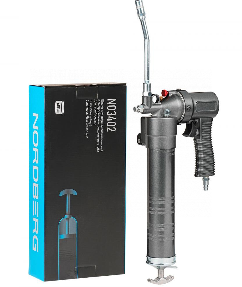 О товаре Пневматический смазочный шприц NORDBERG NO3402 прекрасно подходит для смазки деталей и механизмов в различных узлах, агрегатах, оборудовании и пр. ПРЕИМУЩЕСТВА Шприц оснащен быстросъемным соединением головки, которое позволяет осуществлять быструю замену тубы на новую Угол поворота рукоятки регулируется при помощи красного фиксатора Обладает высоким рабочим ресурсом Оснащен клапаном для стравливания воздуха и клапаном для заправки Может использоваться для картриджей со смазкой УДОБСТВО ИСПОЛЬЗОВАНИЯ Прост в использовании, имеет эргономичную форму Обеспечивает постоянную подачу смазки, пока нажат курок КОМПЛЕКТАЦИЯ Пневматический плунжерный шприц NORDBERG NO3402 Стальная трубка Гибкий шланг 4-лепестковая насадка Предназначен исключительно для перекачки смазок вязкостью до NLGI 2. Шприц для смазки может быть заполнен тубой со смазкой по DIN 1284. Подробную информацию о параметрах и характеристиках пневматического плунжерного шприца NORDBERG NO3402 вы можете получить у наших инженеров и технических специалистов, отправив запрос по почте info@nordberg.ru Показать полностью Скрыть Характеристики Объем, мл 400 Производительность 15 мл / 40 качков Тип шприца плунжерный пневматический Минимальное давление на входе, бар 6 Максимальное давление на входе, бар 6,5 Максимальное выходное давление, бар 250 Работа с картриджем 400 мл Воздушный клапан есть Диаметр впускного отверстия, дюйм 1/4 NPT Шланг в комплекте да Подключение вертикально **Габариты и вес товара с упаковкой Общий вес с упаковкой - 2.07 кг Упаковка Размеры упаковки (Д*Ш*В), мм Вес, кг Упаковка №1 195 x 420 x 85 2.07 ** Теоретический вес