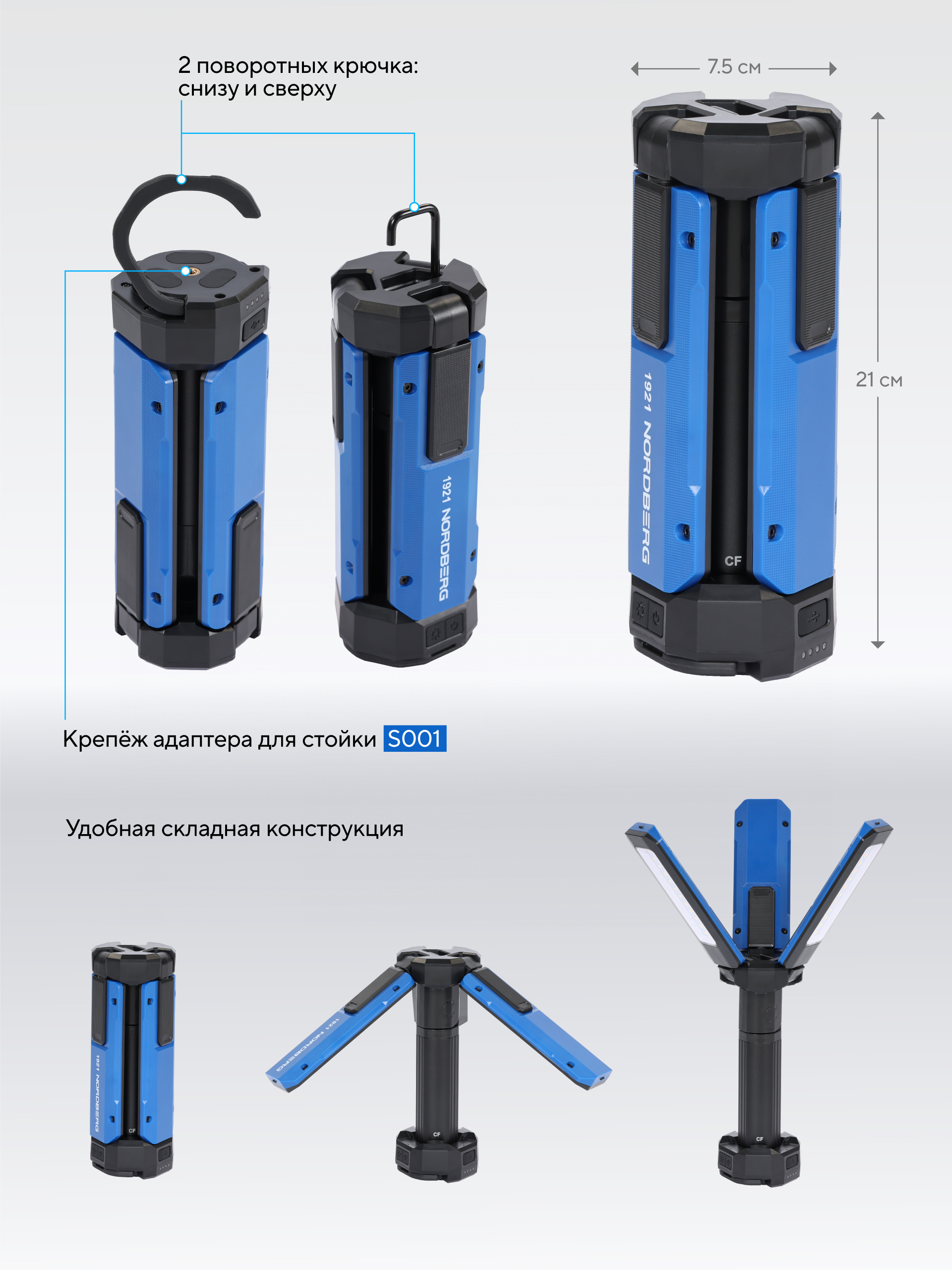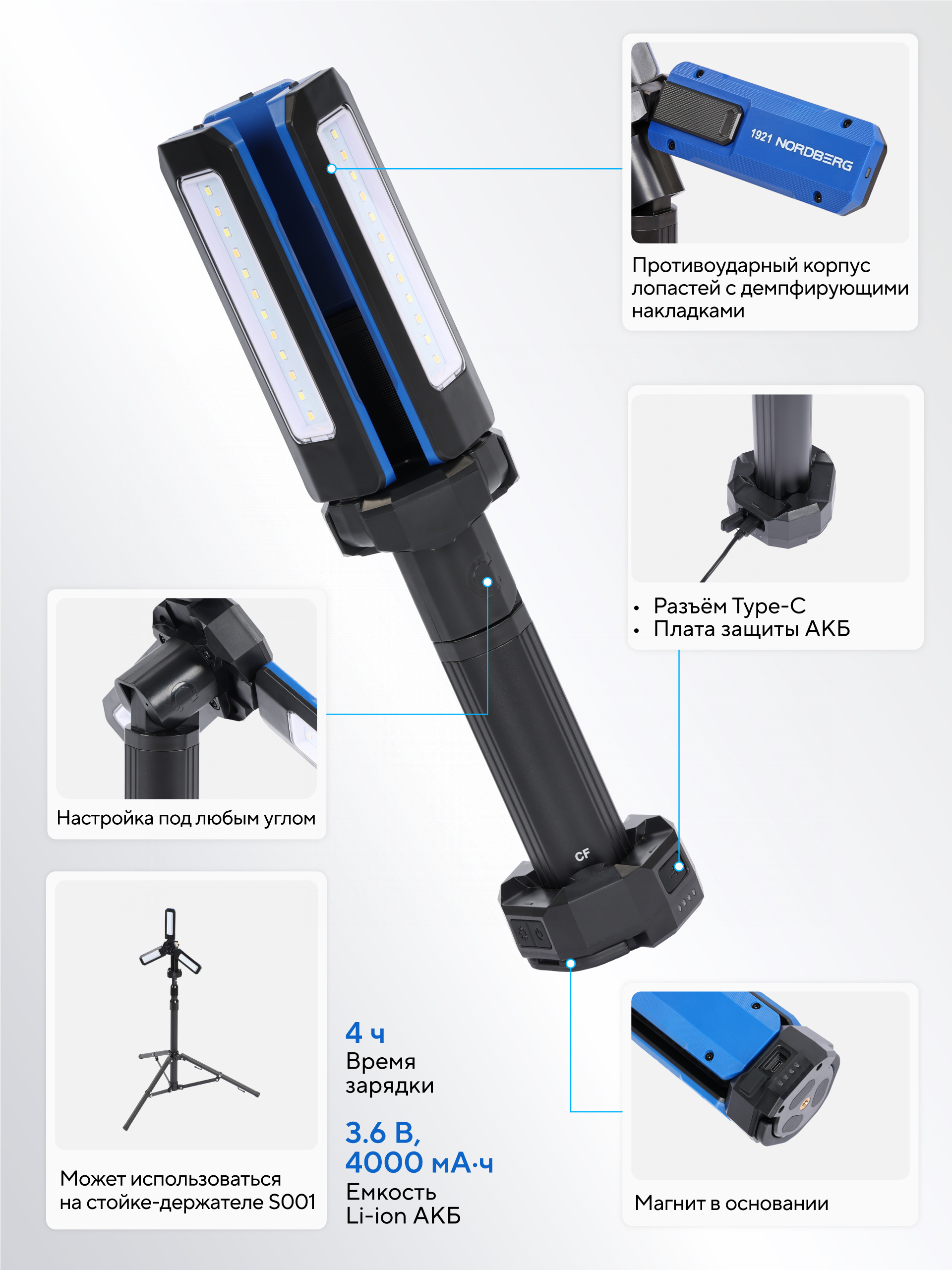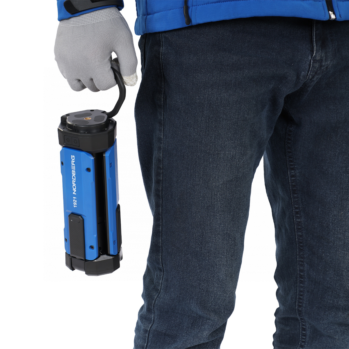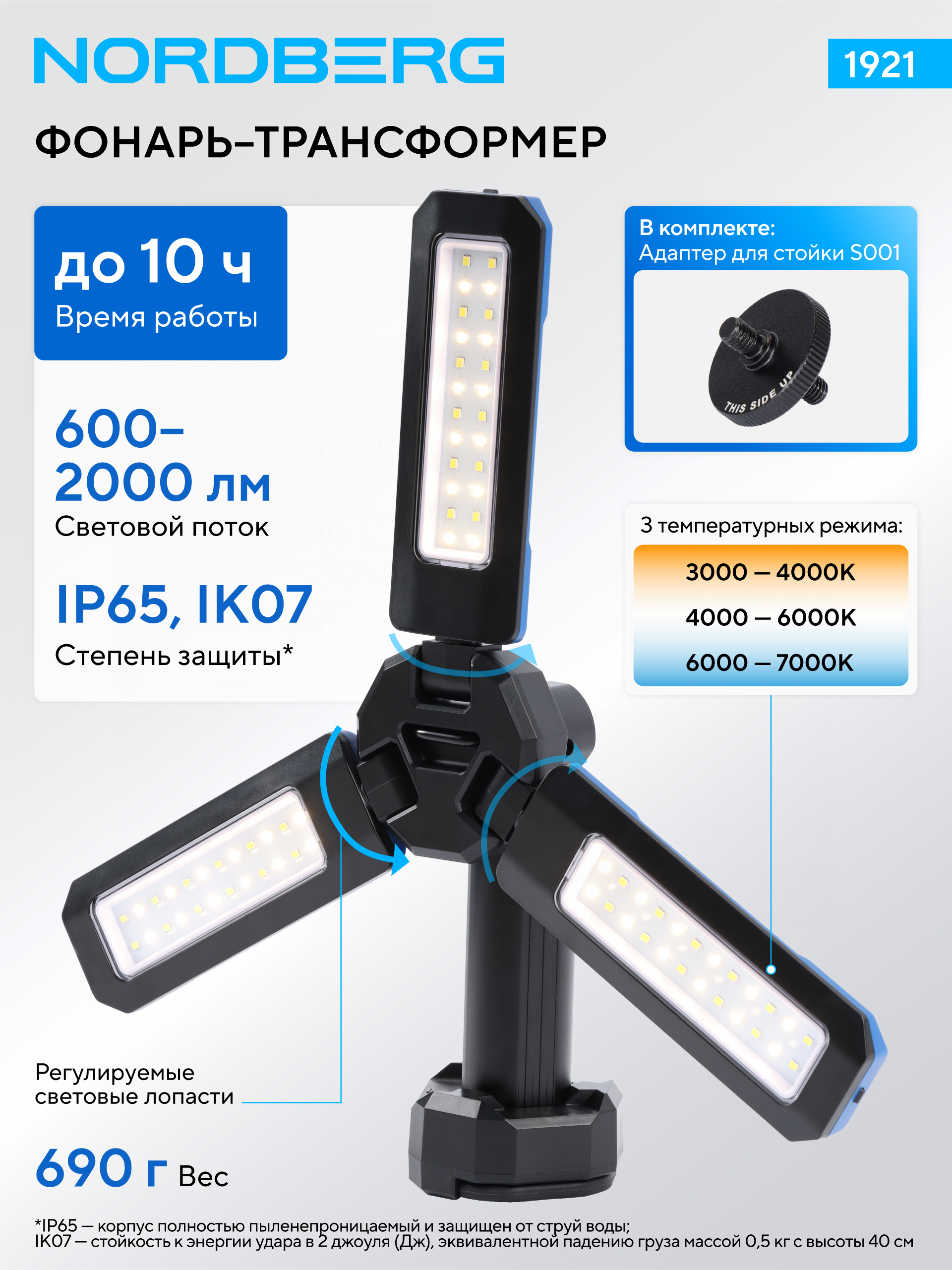 О товаре NORDBERG 1921 — предназначен для локального освещения рабочих зон при техническом обслуживании, диагностике и ремонте автомобилей, мотоциклов, промышленного оборудования и в других условиях с ограниченной видимостью. ПРЕИМУЩЕСТВА Мощный литий-ионный аккумулятор — обеспечивает до 10 часов автономной работы, Быстрая зарядка — полный цикл от 3,5 до 4,5 часов через разъём Type-C, Два поворотных крючка — для удобного подвешивания в различных положениях, Встроенный магнит — надёжная фиксация на металлических поверхностях без дополнительных креплений, Складная конструкция — для освещения в труднодоступных местах, Противоударный корпус с демпфирующими кольцами — устойчивость к механическим повреждениям и падениям, Защита от перезаряда и переразряда — встроенная система BMS продлевает срок службы аккумулятора, В комплект входит адаптер для стойки S001 — для стационарной установки фонаря. NORDBERG 1921 — это универсальный, яркий и надёжный фонарь для освещения рабочих зон. Незаменим для профессионалов, которым нужен яркий свет и свобода движения. Идеален для использования в автосервисах, мастерских, на выезде и в быту. Показать полностью Скрыть Характеристики Световой поток основного, лм 2000 Световой поток торцевого освещения, лм 700 Тип питания Li-ion аккумулятор Li-ion аккумулятор 3.6 В, 4000 мА·ч Сетевой USB-адаптер кабель USB Type-C Тип лампы светодиодная Цветовая температура, К 7000 Время зарядки/работы, ч 3,5~4 / 2~10 Напряжение, В 3.6 Степень защиты IP65, IK07 **Габариты и вес товара с упаковкой Общий вес с упаковкой - 1.5 кг Упаковка Размеры упаковки (Д*Ш*В), мм Вес, кг Упаковка №1 80 x 40 x 100 1.5 ** Теоретический вес