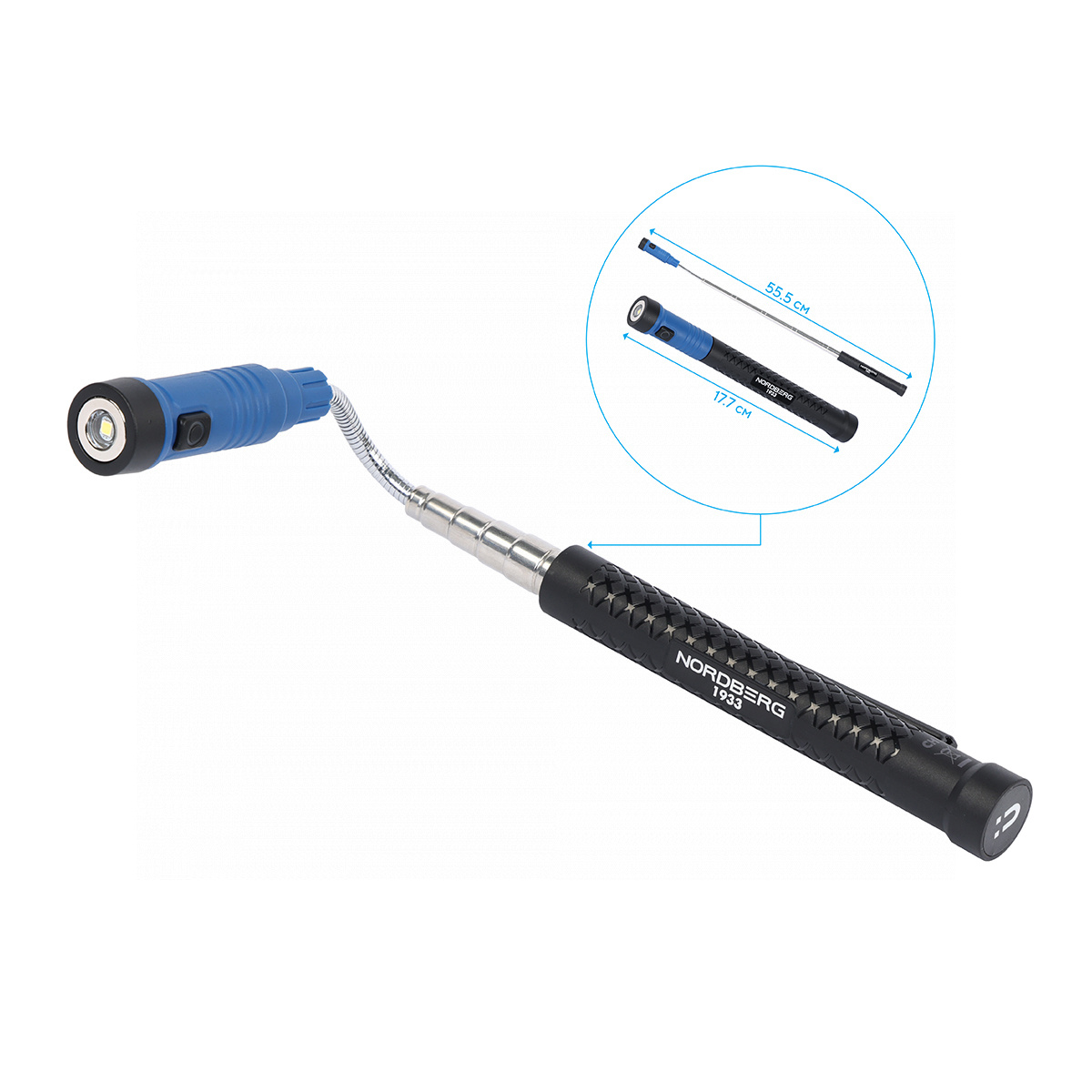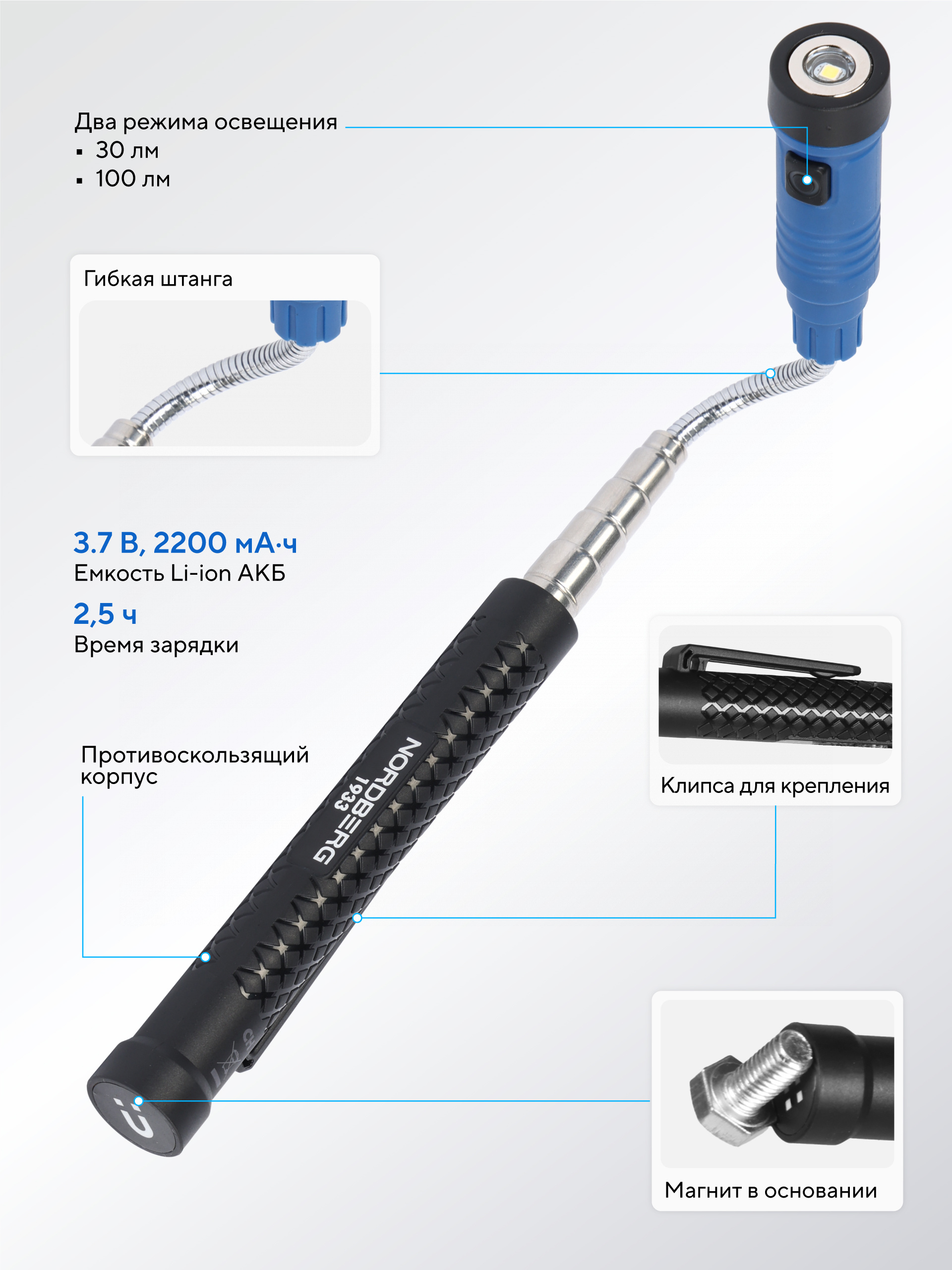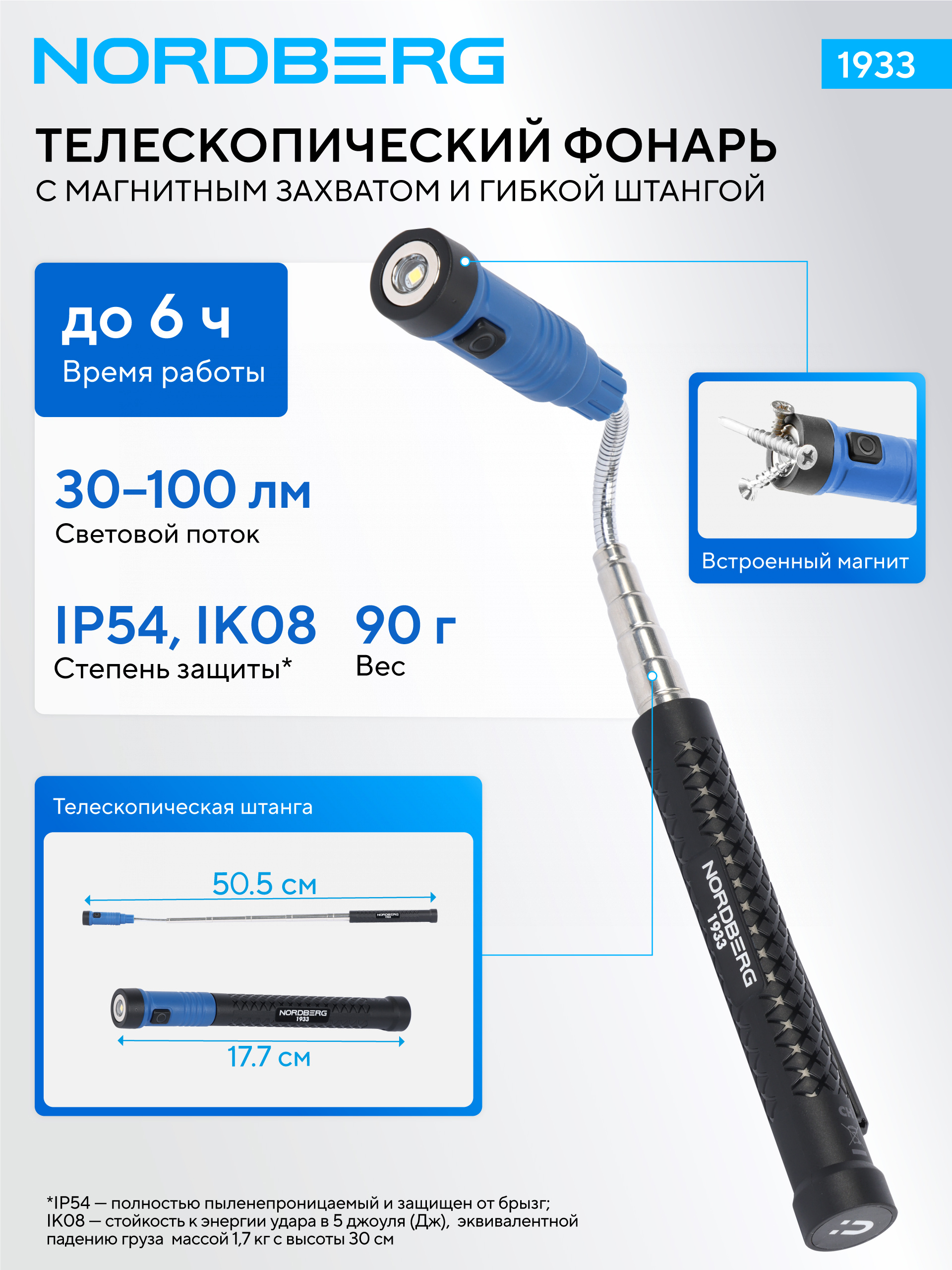 О товаре NORDBERG 1933 – светодиодный аккумуляторный телескопический фонарик с магнитным захватом. ФУНКЦИОНАЛ Освещение труднодоступных мест, таких как углублённые полости, отверстия, цилиндры, блоки, головки, картеры, ниши и установочные поверхности в моторном отсеке и других в местах, где из-за расположения деталей, проводов, тяг и т. д. затруднён доступ обычного фонаря. ПРЕИМУЩЕСТВА Гибкая штанга фонаря регулируется в диапазоне от 17,7 до 50,5 см – удобная подсветка узких труднодоступных зон, Прорезиненная рукоятка позволяет удобно держать фонарь в руках, 2 магнита сверху и снизу фонаря, Два режима освещения – низкая яркость 30 лм, высокая яркость 100 лм, Время работы от 2 до 6 часов в зависимости от выбранного режима, Пыленепроницаемость и влагостойкость по IP54 и IK08. Светодиодный гибкий аккумуляторный фонарь NORDBERG 1933 – удобный компактный инструмент при проведении ремонта, обслуживания или осмотра необходимых деталей и механизмов автомобиля в автосервисах и СТО. Показать полностью Скрыть Характеристики Тип питания Li-ion аккумулятор Li-ion аккумулятор 3.7 В, 2200 мА·ч Сетевой USB адаптер кабель USB Type-C Тип лампы светодиодная Напряжение, В 3.7 Время зарядки/работы, ч 2,5 / 2~6 Степень защиты IP54, IK08 **Габариты и вес товара с упаковкой Общий вес с упаковкой - 0.2 кг Упаковка Размеры упаковки (Д*Ш*В), мм Вес, кг Упаковка №1 180 x 50 x 30 0.2 ** Теоретический вес