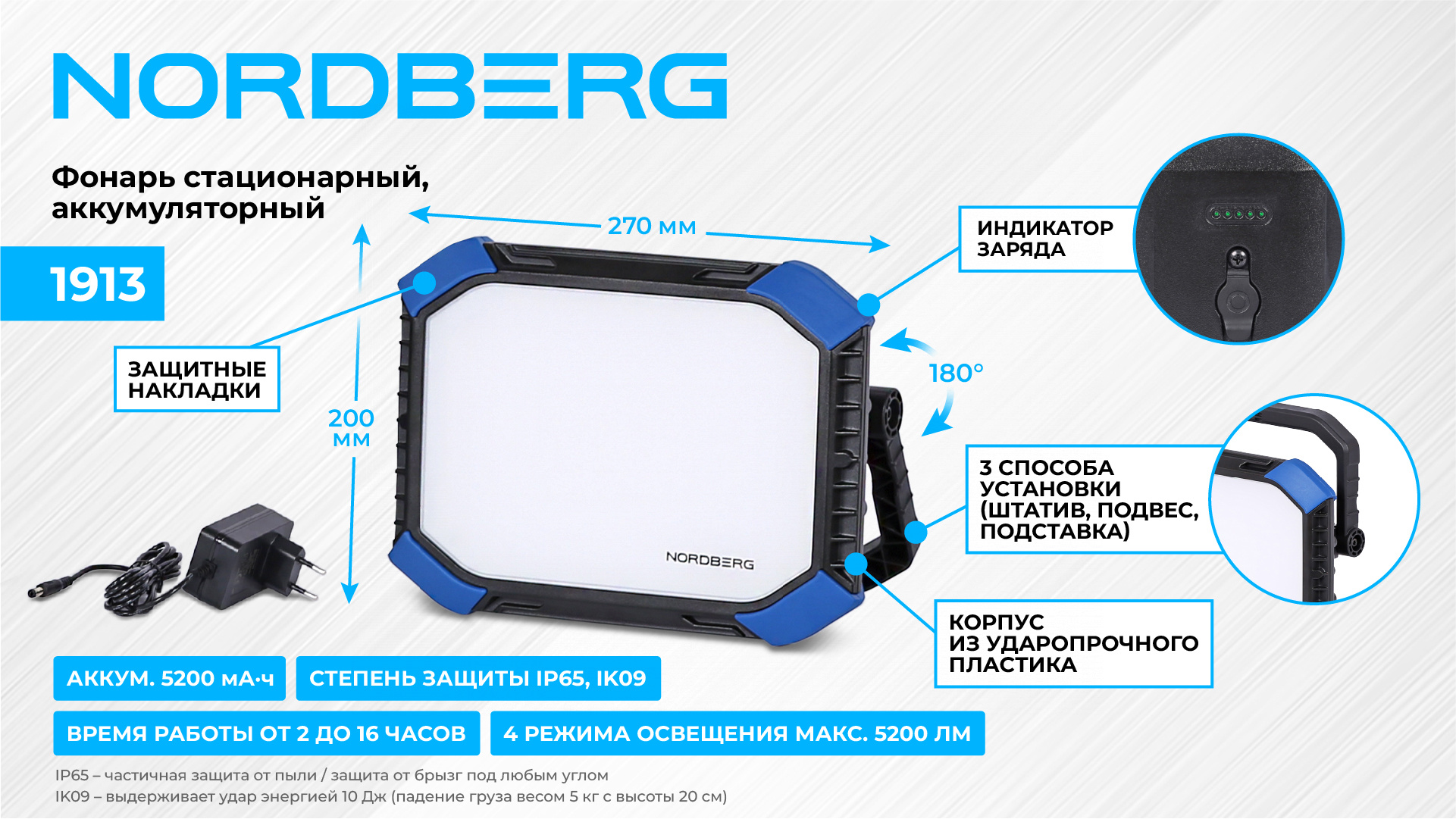 О товаре Светодиодный аккумуляторный стационарный фонарь NORDBERG 1913 – осветительный прибор для профессионального использования в автосервисах и СТО. ФУНКЦИОНАЛ Предназначен для прожекторного освещения пространства и объектов, обеспечивая мощный, рассеянный свет. Применяется в автосервисах, строительных, промышленных площадках и т. д. ПРЕИМУЩЕСТВА Корпус с защищенными краями выполнен из ударопрочного пластика. Высококачественные SMD-светодиоды, срок службы которых составляет более 100 000 часов. Четыре режима яркости: – 400 лм в режиме эко – 1300 лм в минимальном режиме – 2400 лм в среднем режиме – 5200 лм при полной нагрузке. Время работы от 2 до 16 часов в зависимости от выбранного режима. Отсутствие бликов и специальное рассеивание света для интенсивного освещения. Пыленепроницаемость, водостойкость и ударостойкость по IP65, IK09. Зарядка встроенного аккумулятора осуществляется от внешнего источника питания 220 В AC/DC, 15 В, 1,5 А. УДОБСТВО ИСПОЛЬЗОВАНИЯ Регулируемый кронштейн, поворачивающийся на 180° можно устанавливать на штатив или крепить на кронштейн магнит. КОМПЛЕКТАЦИЯ фонарь кабель зарядный паспорт-инструкция Светодиодный стационарный фонарь NORDBERG 1913 обеспечивает мощное освещение рабочей площадки во время проведения работ по ремонту автомобиля, при строительстве, для сервисных или производственных работ в условиях недостаточной видимости. Показать полностью Скрыть Характеристики Световой поток основного освещения, лм 5200 Тип питания Li-ion аккумулятор Li-ion аккумулятор 11,1 В / 5000 мА·ч Сетевой USB адаптер кабель зарядный Тип лампы светодиодная Цветовая температура, К 6500 Время зарядки/работы, ч 3,5 / 2-16 Потребляемая мощность, Вт 10 Степень защиты IP65, IK09 **Габариты и вес товара с упаковкой Общий вес с упаковкой - 1.812 кг Упаковка Размеры упаковки (Д*Ш*В), мм Вес, кг Упаковка №1 280 x 265 x 90 1.812 ** Теоретический вес