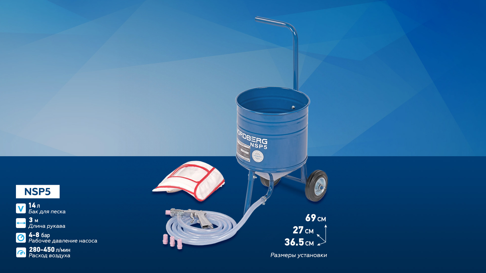 О товаре Установка пескоструйная открытая с баком для песка NORDBERG NSP5 – профессиональный аппарат для обработки различных поверхностей воздушно-пескоструйным способом. ФУНКЦИОНАЛ Подача воздуха с абразивом в шлифовальный пистолет позволяет снять ржавчину, окалину, застерелую краску, заусенцы, сгладить шероховатости, упрочнить поверхность перед нанесением покрытий. ПРЕИМУЩЕСТВА Легкая загрузка абразива в бак объемом 14 л. Высокое качество очистки поверхностей Простое понятное управление Защитная маска в комплекте УДОБСТВО ИСПОЛЬЗОВАНИЯ Широкая рукоятка и большие колеса позволяют с легкостью перемещать установку. Опора для устойчивости. КОМПЛЕКТАЦИЯ Установка с баком для песка Шланг 3 м Керамические сопла – 1 комплект (4, 5, 6 и 7 мм) Защитная маска Паспорт-инструкция Передвижной насыпной пескоструйный аппарат NORDBERG NSP5 – специальное оборудование, которое поможет с легкостью обработать поверхности при покрасочных или других работах в современных автосервисах и СТО. Рекомендуем использовать в качестве абразива порошок NORDBERG NS16CS Показать полностью Скрыть Характеристики Объем резервуара для песка, л 14 Длина рукава, м 3 Размер, см 51х33х35 Расход воздуха, л/мин 280-450 Рабочее давление насоса, бар 4-8 **Габариты и вес товара с упаковкой Общий вес с упаковкой - 5.6 кг Упаковка Размеры упаковки (Д*Ш*В), мм Вес, кг Упаковка №1 510 x 330 x 350 5.6 ** Теоретический вес