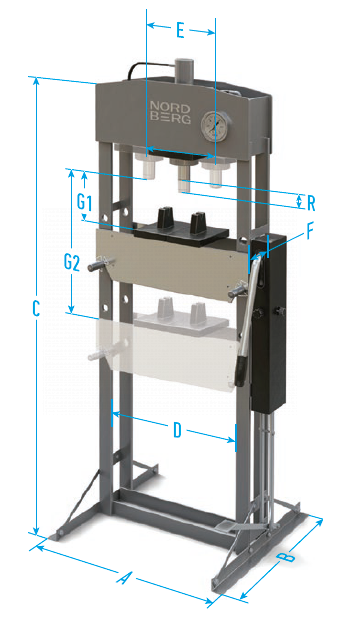 О товаре Пресс гидравлический 20т, разборная рама NORDBERG N3621FL Гидравлический насос с ручным приводом и с ножным приводом Гидравлический цилиндр, усилие 20 тонн Устойчивое основание для установки на пол Регулируемый рабочий стол Две пластины-трапеции Эргономичная рукоятка возврата поршня Предохранительный клапан для защиты от перегрузок Манометр большого диаметра для контроля силы нагрузки Поставляется в двух картонных коробках Показать полностью Скрыть Характеристики Усилие, т 20 Ширина (A), мм 730 Глубина (B), мм 700 Высота (C), мм 1550 Ширина рабочего стола (D), мм 535 Горизонтальное смещение (E), мм 385 Глубина рабочего стола (F), мм 95 Минимальный подъем станины (G1), мм 160 Максимальный подъем станины (G2), мм 1035 Гидравлический ход (R), мм 155 Ход винта - Привод насоса ручной + педаль Исполнение напольный **Габариты и вес товара с упаковкой Общий вес с упаковкой - 91 кг Упаковка Размеры упаковки (Д*Ш*В), мм Вес, кг Упаковка №1 1540 x 170 x 120 56 Упаковка №2 690 x 270 x 160 35.4 ** Теоретический вес