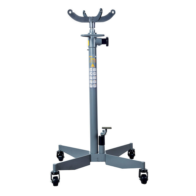 Данная трансмиссионная стойка компактна и способна выдерживать достаточно большие нагрузки во многом благодаря имеющемуся гидравлическому приводу. Телескопический шток гидроцилиндра поднимается на высоту 2000 мм, что позволяет использовать стойку даже в смотровой яме. Хромированный шток гидроцилиндра надежно защищён от коррозии. Гидравлический насос с педальным приводом и защитный клапан, контролирующий перегрузку, создают удобство и безопасность в работе. Гидравлический двухступенчатый насос обеспечивает быстрый подъем и мягкое пропорциональное опускание. Четыре поворотных самоориентирующихся колеса и удобная ручка гарантируют быстрое и легкое перемещение стойки в необходимое место. Колеса изготовлены из высокопрочного нейлона и не портят покрытие в цеху. Широка база опорных ног обеспечивает устойчивость под нагрузкой.