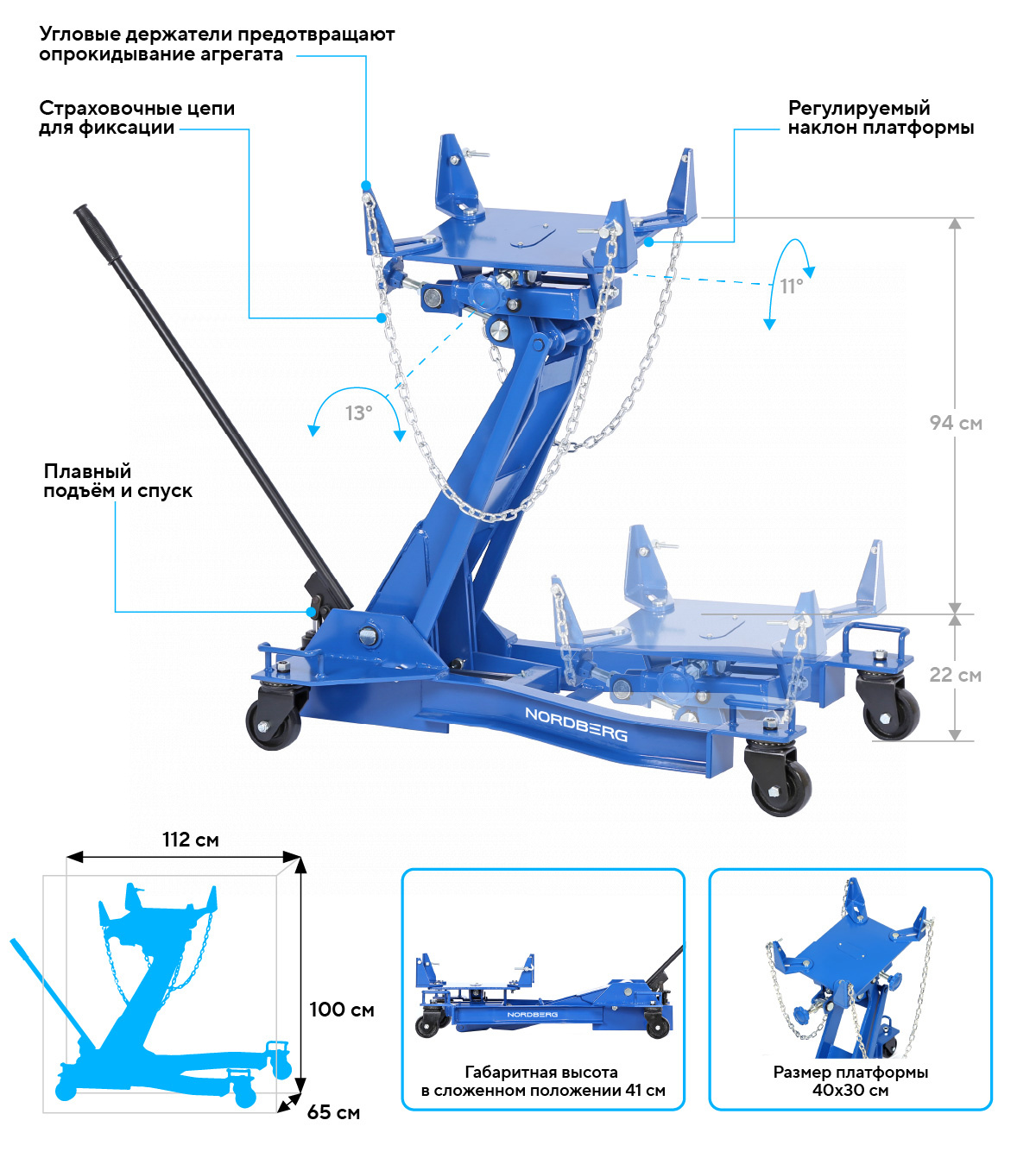 О товаре NORDBERG N32215 — профессиональный подкатной усиленный трансмиссионный домкрат 2 тонны. Используется в автосервисах, гаражах и на станциях технического обслуживания. ФУНКЦИОНАЛ Предназначен для подъема и опускания узлов трансмиссии автомобиля. ПРЕИМУЩЕСТВА Поднимает агрегаты массой до 1,5 т — подходит для грузовых автомобилей, Диапазон высоты от 220 мм до 940 мм позволяет использовать домкрат в различных условиях, Регулируемый наклон платформы: поперечный наклон 13°, продольный 11° — обеспечивает точное позиционирование трансмиссии перед установкой, Угловые держатели предотвращают опрокидывание агрегата, обеспечивая дополнительную безопасность. УДОБСТВО ИСПОЛЬЗОВАНИЯ Эргономичное перемещение: четыре удобные ручки позволяют легко позиционировать домкрат под трансмиссией, Плавный подъём и спуск: точный контроль высоты исключает рывки, минимизируя риск повреждения деталей, Страховочные цепи надёжно фиксирует агрегат на платформе, исключая его смещение во время работы, Компактные размеры: общие габариты 1083×654 мм делают домкрат удобным для хранения и транспортировки, Удобное управление: длинная рукоятка и спускной клапан позволяют легко регулировать подъём и опускание платформы, Надёжная фиксация груза: регулируемые держатели и страховочная цепь обеспечивают стабильное положение агрегата, Простая регулировка: управление наклоном платформы с помощью удобных винтовых механизмов позволяет точно подогнать положение под нужный угол. КОМПЛЕКТАЦИЯ Грузовой домкрат подкатной трансмиссионный – 1 шт, Ручка подъема – 1 шт, Угловые держатели – 4 шт, Регуляторы наклона платформы – 2 шт, Страховочная цепь – 2 шт, Крюк для крепления цепи – 1 шт, Инструкция по эксплуатации – 1 шт. NORDBERG N32215 — надежное и удобное решение для профессионального ремонта трансмиссий. Показать полностью Скрыть Характеристики Грузоподъемность максимальная, т 1,5 Минимальная высота подхвата, см 22 Максимальная высота подъема, см 94 Спуск ручной Двухплунжерный насос нет **Габариты и вес товара с упаковкой Общий вес с упаковкой - 143 кг Упаковка Размеры упаковки (Д*Ш*В), мм Вес, кг Упаковка №1 1125 x 715 x 410 143 ** Теоретический вес