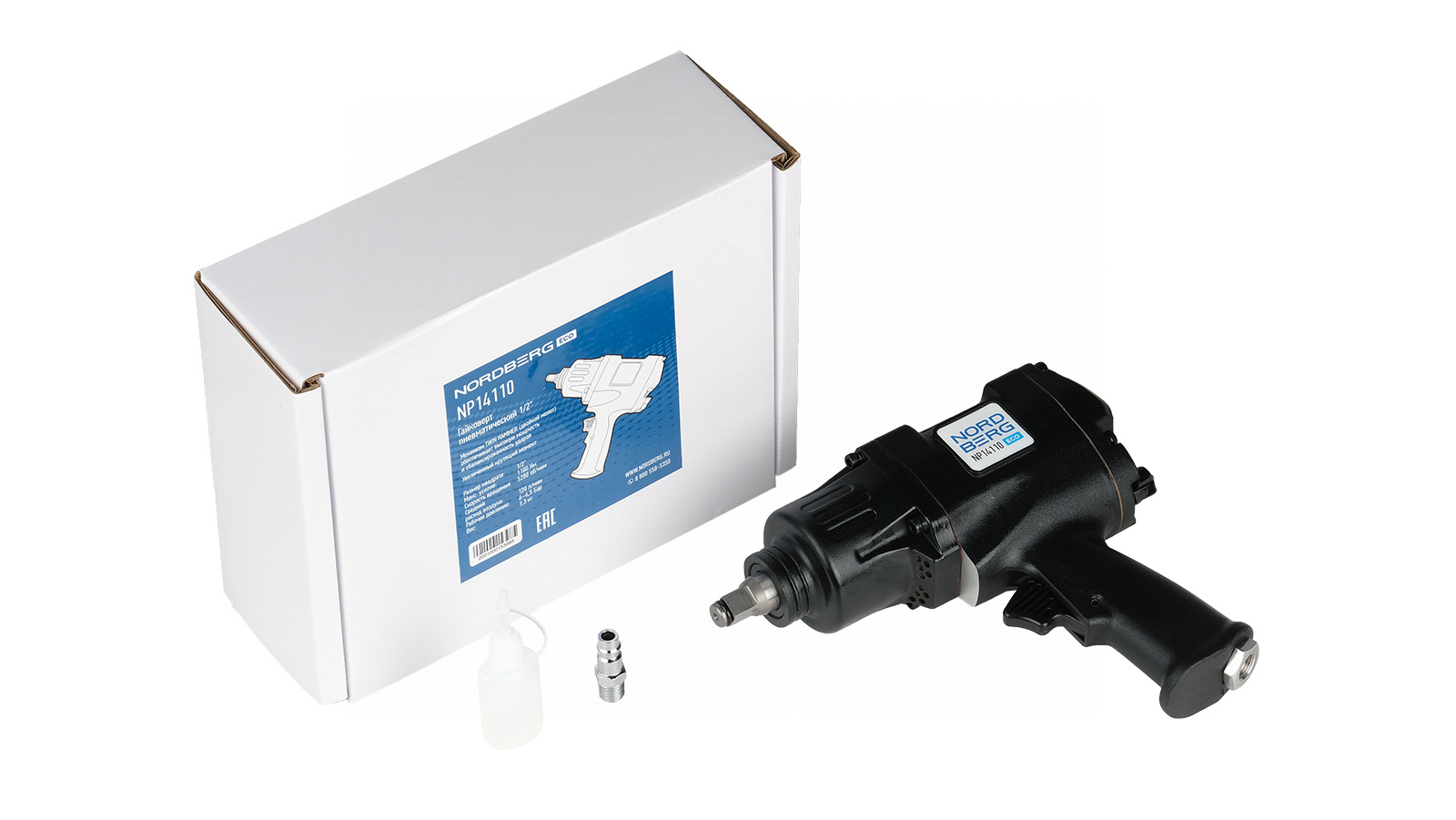 О товаре Пневмогайковерт ударный NORDBERG NP14110 – профессиональное пневматическое оборудование для автосервисов, станций шиномонтажа и автотранспортных предприятий. ФУНКЦИОНАЛ Предназначен для работы с резьбовыми соединениями при проведении ремонтных работ, связанных с откручиванием и закручиванием гаек и болтов, а также других крепежных элементов в грузовом шиномонтаже, автосервисах, а также для промышленного применения. ПРЕИМУЩЕСТВА Система TWIN-HAMMER (двойной молот), обеспечивающая высокую мощность и сбалансированность ударов Выброс воздуха направлен вниз, что предотвращает попадания паров масла на рабочую поверхность УДОБСТВО ИСПОЛЬЗОВАНИЯ Эргономичная продуманная конструкция для удобного удерживания инструмента в руках и простой механизм включения и работы. КОМПЛЕКТАЦИЯ Ударный пневмогайковерт NORDBERG NP14110 Паспорт-инструкция Пневматический гайковерт NORDBERG NP14110 позволит проводить эффективную, быструю и качественную работу при шиномонтажных и ремонтных операциях с автомобилем. Показать полностью Скрыть Характеристики Диаметр впускного отверстия, дюйм 1/4 Посадочный квадрат, дюйм 1/2 Максимальное усилие, Нм 1100 Рабочее давление, бар 6 Скорость свободного вращения, об/мин 5200 Среднее потребление воздуха, л/мин 120 Исполнение стандартный Регулировка момента затяжки есть Тип ударного механизма TWIN-HAMMER **Габариты и вес товара с упаковкой Общий вес с упаковкой - 3.7 кг Упаковка Размеры упаковки (Д*Ш*В), мм Вес, кг Упаковка №1 275 x 210 x 100 3.7 ** Теоретический вес
