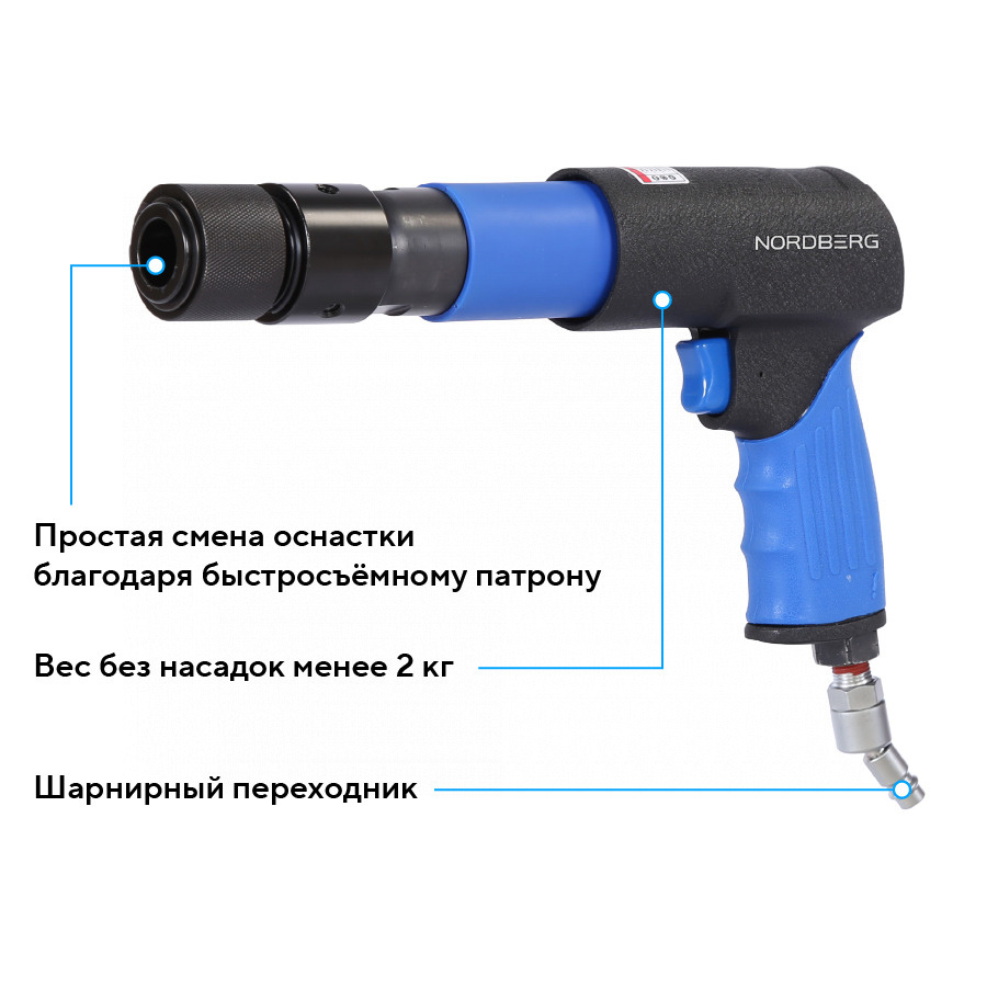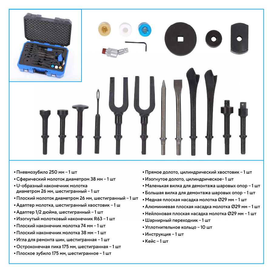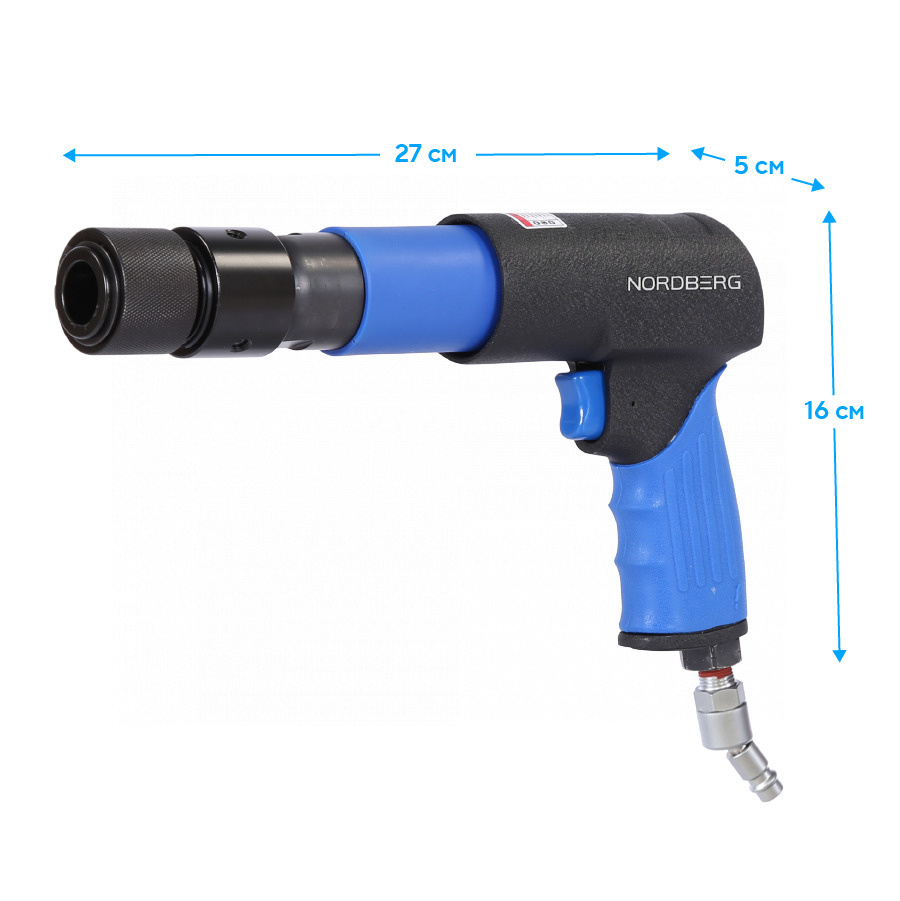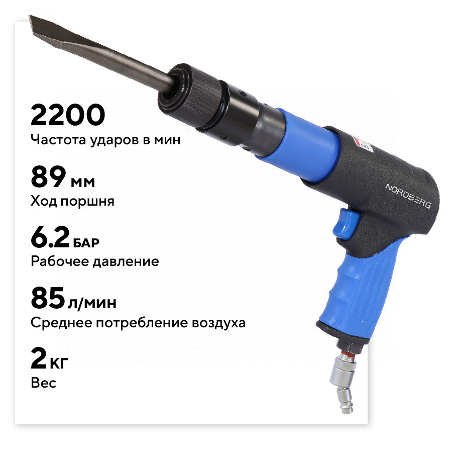 О товаре NORDBERG NP5070K1 — профессиональное пневмозубило с расширенной комплектацией для кузовного ремонта и демонтажных работ. ФУНКЦИОНАЛ Предназначено для срубания болтов, заклёпок, ремонта кузова и демонтажа шаровых опор. Оснащено быстросъёмным патроном для быстрой смены насадок. Рабочее давление — 6,2 бар, до 2200 ударов в минуту. Не подходит для закалённых сплавов. ПРЕИМУЩЕСТВА Комплексная универсальность — в комплект входит 20 насадок и адаптеров для различных задач, включая молотки, пики, зубила, вилки для демонтажа и специализированные наконечники, Быстрая смена оснастки — благодаря быстросъёмному патрону замена насадок занимает секунды, Удобные ручки и курок — эргономичная форма корпуса обеспечивает комфорт при длительной работе, Компактный и лёгкий — длина всего 250 мм, вес менее 2 кг без насадок, Плавный ход и высокая частота — 2200 ударов в минуту с ходом поршня 89 мм позволяют работать эффективно даже с жёсткими соединениями, Защита и комфорт — комплектуется кейсом, смазочной ёмкостью и шарнирным переходником, Подходит для работы в ограниченном пространстве — благодаря компактному корпусу и разноплановым насадкам. КОМПЛЕКТАЦИЯ Пневмозубило 250 мм – 1 шт, Сферический молоток диаметром 38 мм – 1 шт, U-образный наконечник молотка диаметром 26 мм, шестигранный – 1 шт, Плоский молоток диаметром 26 мм, шестигранный – 1 шт, Адаптер молотка, шестигранный хвостовик – 1 шт, Адаптер 1/2 дюйма, шестигранный – 1 шт, Изогнутый молотковый наконечник R63 – 1 шт, Плоский наконечник молотка 74 мм – 1 шт, Плоский наконечник молотка 38 мм – 1 шт, Игла для ремонта шин, шестигранная – 1 шт, Остроконечная пика 175 мм, шестигранная – 1 шт, Плоское зубило 175 мм, шестигранное – 1 шт, Прямое долото, цилиндрический хвостовик – 1 шт, Изогнутое долото, цилиндрическое– 1 шт, Маленькая вилка для демонтажа шаровых опор – 1 шт, Большая вилка для демонтажа шаровых опор – 1 шт, Медная плоская насадка молотка Ø29 мм – 1 шт, Алюминиевая плоская насадка молотка Ø29 мм – 1 шт, Нейлоновая плоская насадка молотка Ø29 мм – 1 шт, Шарнирный переходник – 1 шт, Уплотнительное кольцо – 10 шт, Инструкция – 1 шт, Кейс – 1 шт. NORDBERG NP5070K1 — мощное решение для широкого спектра задач, где требуется сила, точность и скорость. Идеален для СТО, кузовного ремонта и демонтажных операций. Показать полностью Скрыть Характеристики Рабочее давление, бар 6 Среднее потребление воздуха, л/мин 85 Диаметр впускного отверстия, дюйм 1/4 Частота ударов, л/мин 2 200 Комплектация комплект насадок Ход поршня, мм 89 **Габариты и вес товара с упаковкой Общий вес с упаковкой - 8 кг Упаковка Размеры упаковки (Д*Ш*В), мм Вес, кг Упаковка №1 460 x 130 x 350 8 ** Теоретический вес
