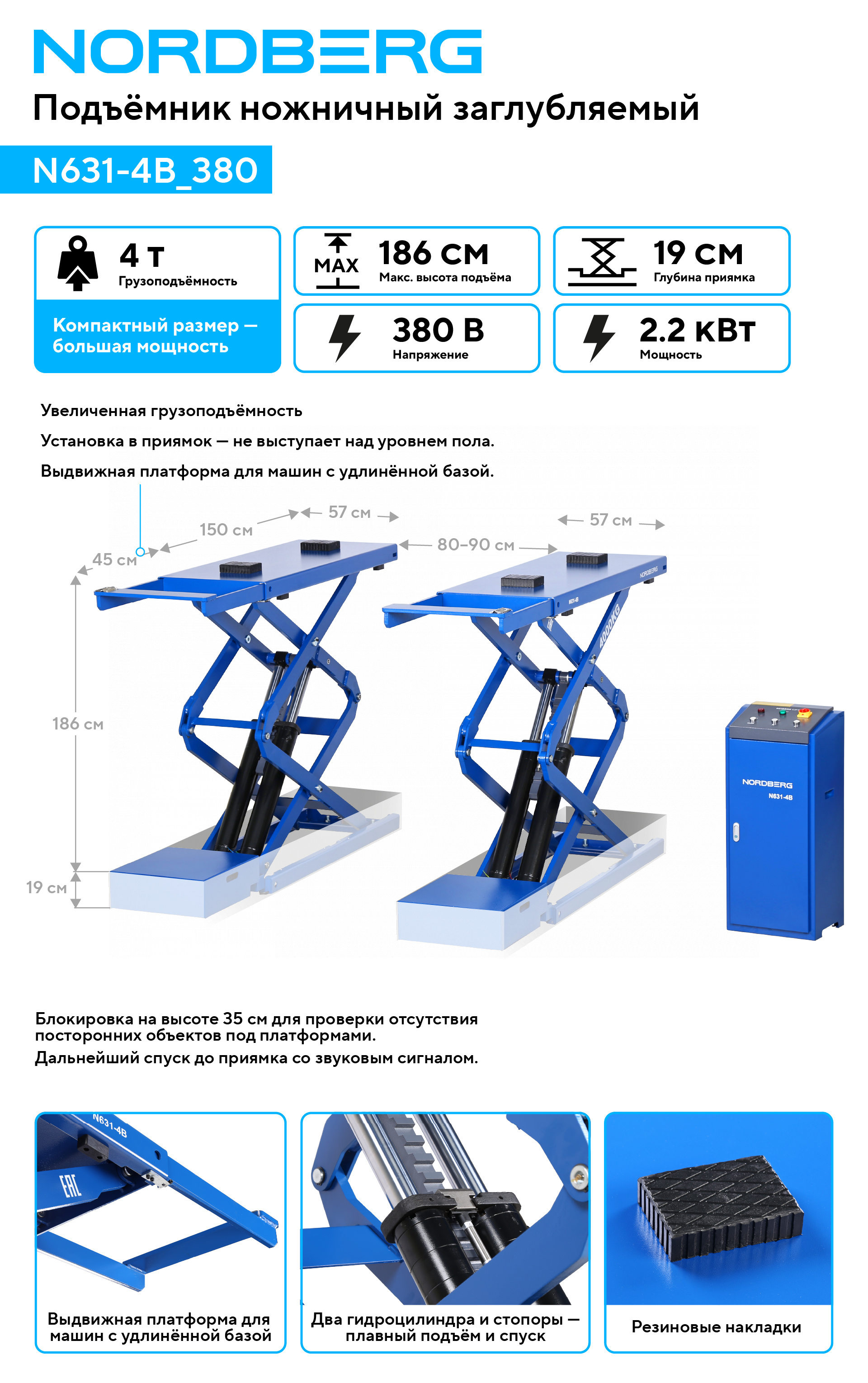 О товаре NORDBERG N631-4B_380 — электрогидравлический ножничный подъёмник, рассчитанный на подъём автомобилей массой до 4 тонн. ФУНКЦИОНАЛ Предназначен для безопасного и плавного подъёма легковых автомобилей и лёгких коммерческих транспортных средств при проведении технического обслуживания, диагностики и ремонта. Благодаря выдвижной секции и широким платформам оборудование подходит для автомобилей с различной колёсной базой. ПРЕИМУЩЕСТВА Монтаж в приямок — позволяет сохранить ровный пол, эффективно использовать площадь автосервиса и придаёт рабочей зоне аккуратный, опрятный вид. Обеспечивает беспрепятственный заезд автомобилей с низким дорожным просветом без дополнительных трапов, Максимальная высота подъёма — 186 см от пола — обеспечивает комфортный доступ к нижней части автомобиля, Широкие 57 см и длинные 150–195 см платформы обеспечивают совместимость с широким модельным рядом автомобилей, Удалённое управление подъёмником с помощью пульта — удобство и контроль на расстоянии, Система безопасности — перепускной клапан, антидетонационные клапаны и стопорный механизм с зубчатым зацеплением, Плавный подъём и опускание — за счёт надёжных гидроцилиндров и дроссельного клапана. NORDBERG N631-4B_380 — это надёжный и безопасный подъёмник, обеспечивающий прочность, удобство и высокий уровень технической безопасности при ремонте и обслуживании автомобилей. Идеален для профессионального применения в автосервисах и технических центрах. Показать полностью Скрыть Характеристики Грузоподъемность максимальная, т 4 Минимальная высота подъема, см 19 Максимальная высота подъема, см 205 Ширина платформы, см 57 Минимальная длина платформы, см 150 Максимальная длина платформы, см 195 Расстояние между платформами, см 80-90 Ширина, мм 2 040 Время подъема, с 50 Разблокировка электро Функция аварийного опускания нет Подъемник второго уровня нет Подходит для сход-развала нет Напряжение, В 380 Потребляемая мощность, кВт 2.2 **Габариты и вес товара с упаковкой Общий вес с упаковкой - 850 кг Упаковка Размеры упаковки (Д*Ш*В), мм Вес, кг Упаковка №1 1550 x 560 x 590 358 Упаковка №2 1550 x 560 x 590 349 Упаковка №3 1020 x 510 x 385 54 Упаковка №4 370 x 520 x 580 89 ** Теоретический вес