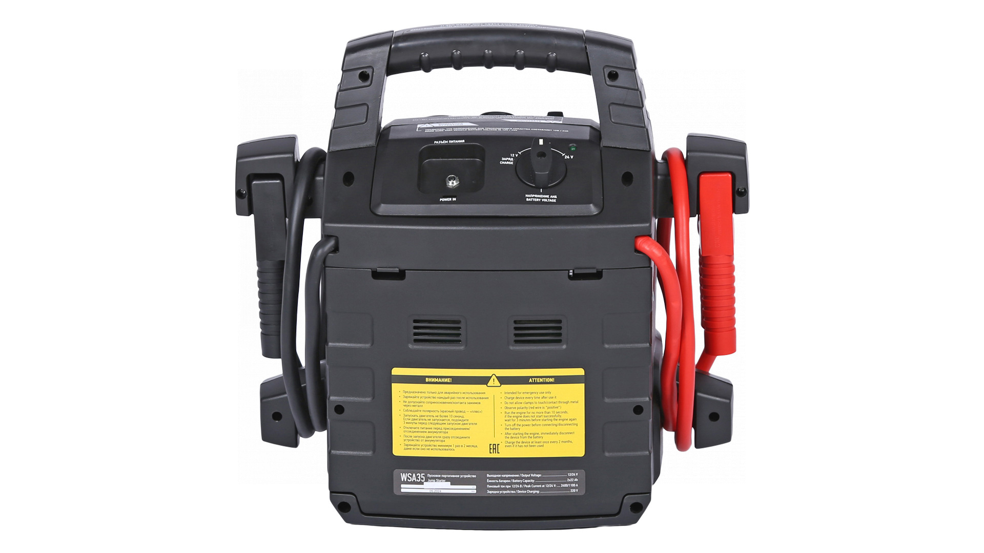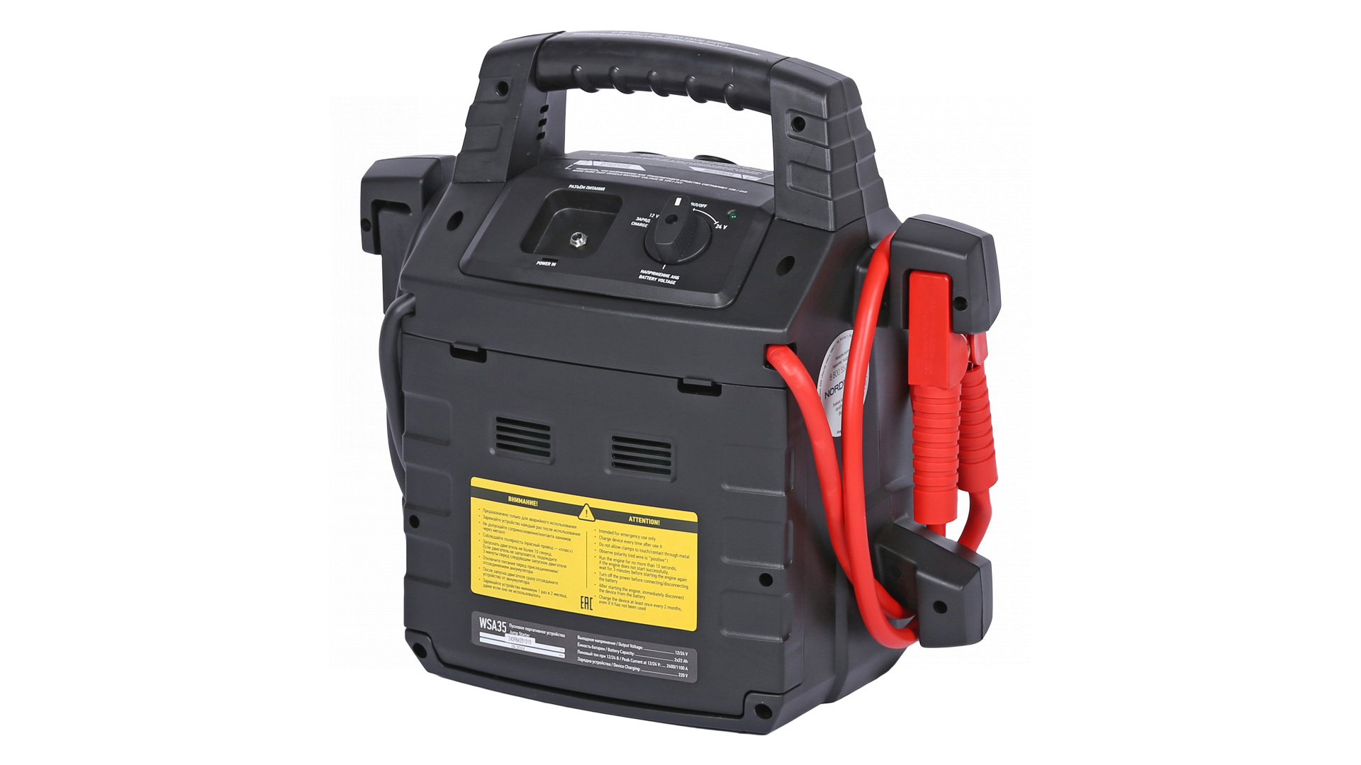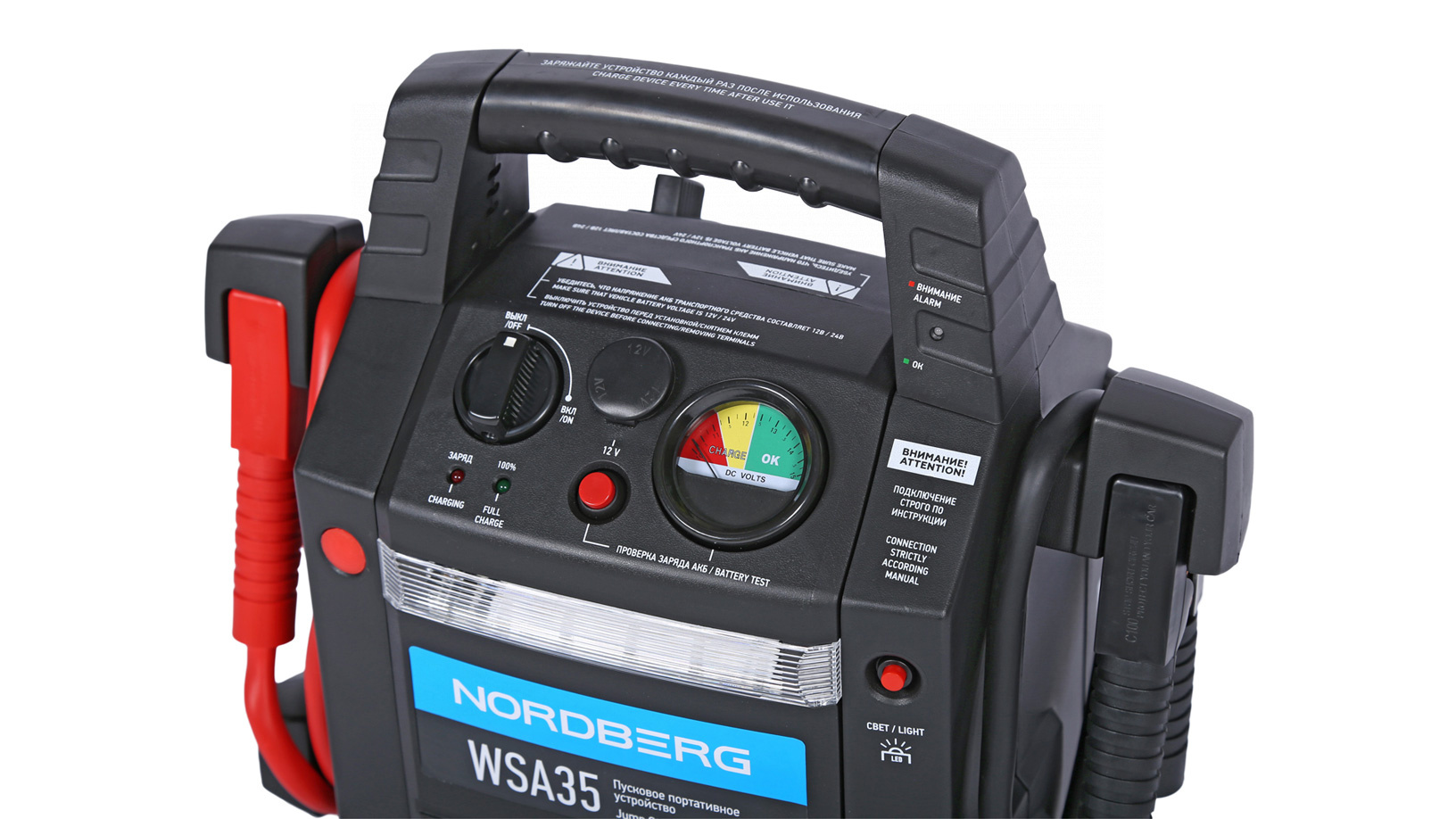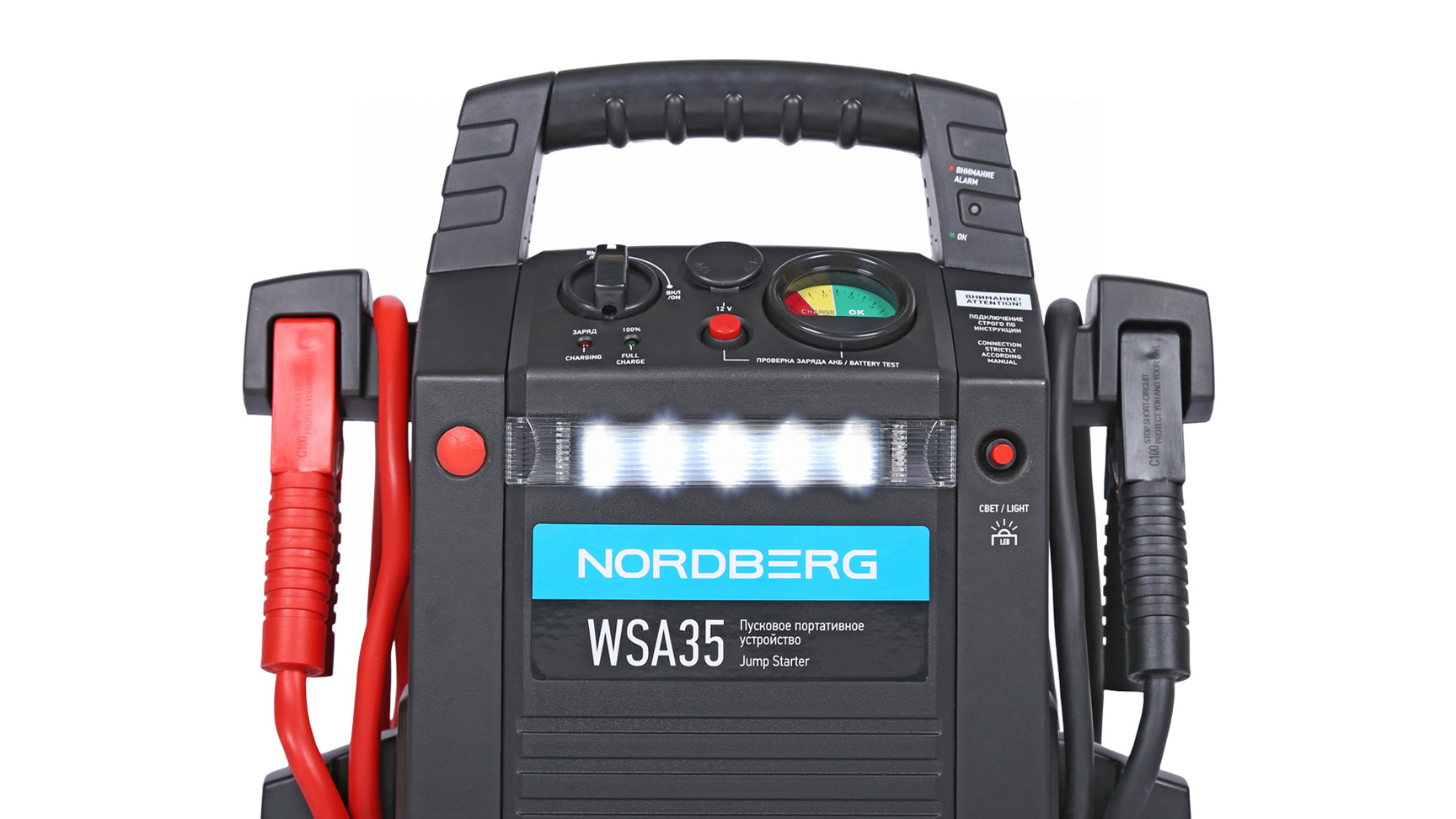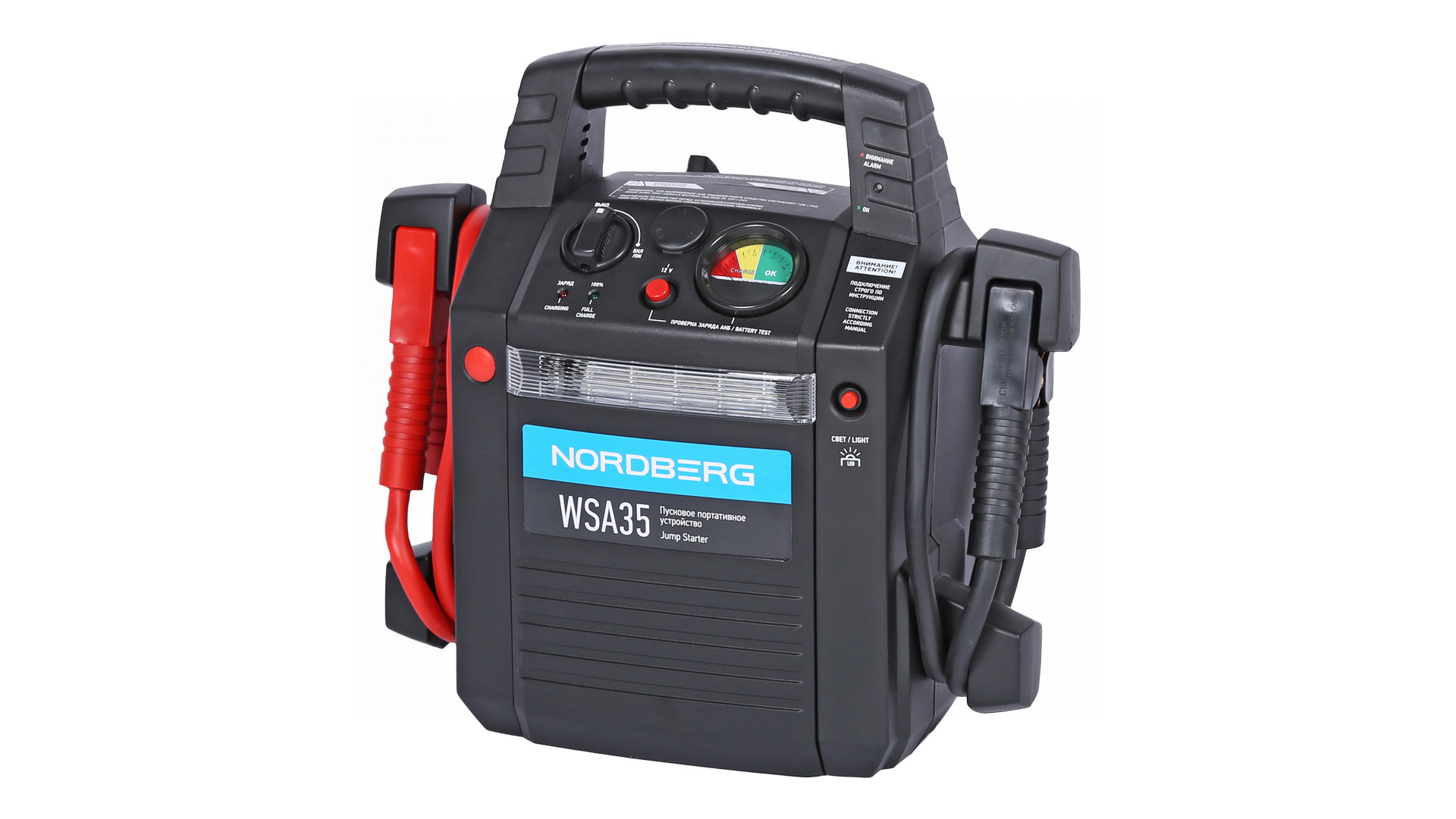 О товаре Пусковое портативное устройство NORDBERG WSA35 – компактная модель для запуска бензиновых и дизельных двигателей. ФУНКЦИОНАЛ Устройство предназначено для быстрого запуска двигателей транспортных средств с аккумуляторной батареей 12 В или 24 В в условиях, когда аккумулятор транспортного средства разряжен. Бустер также используется для зарядки телефонов, планшетов и видеокамер и др. устройств, у которых входное напряжение ЗУ составляет 12 В. ПРЕИМУЩЕСТВА И ОСОБЕННОСТИ Совместим со всеми типами свинцово-кислотных аккумуляторов: STD-CA, WET, MF, EFB, GEL, AGM Максимальный пусковой ток 500/1100 А, пиковый ток 1100А/2400 А Емкость встроенной AGM батареи 2х22 А·ч Может работать при температуре окружающего воздуха до -40 °С Медные провода с сечением 35 мм² обладают высокой пропускной способностью Встроенный светодиодный фонарь УДОБСТВО ИСПОЛЬЗОВАНИЯ Эргономичная ручка для переноски Звуковая и световая сигнализация о режимах работы Небольшой вес и габариты КОМПЛЕКТАЦИЯ пусковое устройство NORDBERG WSA35 кабель с двумя штекерами для розетки 12 В блок питания 220 В паспорт-инструкция Бустер NORDBERG WSA35 – универсальное устройство, позволяющее в кратчайшие сроки как запустить различные двигатели, так и зарядить мобильные устройства. Показать полностью Скрыть Характеристики Емкость встроенного аккумулятора, А·ч 44 Максимальный пусковой ток, А 2400 Напряжение заряда, В 12/24 Вес товара, кг 16 **Габариты и вес товара с упаковкой Общий вес с упаковкой - 17 кг Упаковка Размеры упаковки (Д*Ш*В), мм Вес, кг Упаковка №1 440 x 265 x 420 17 ** Теоретический вес
