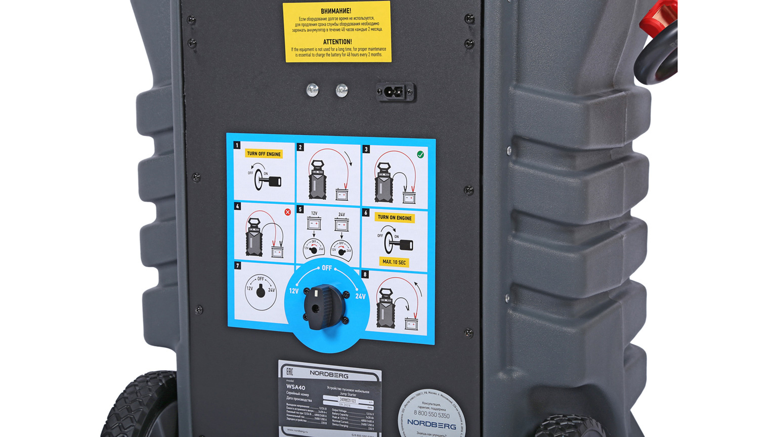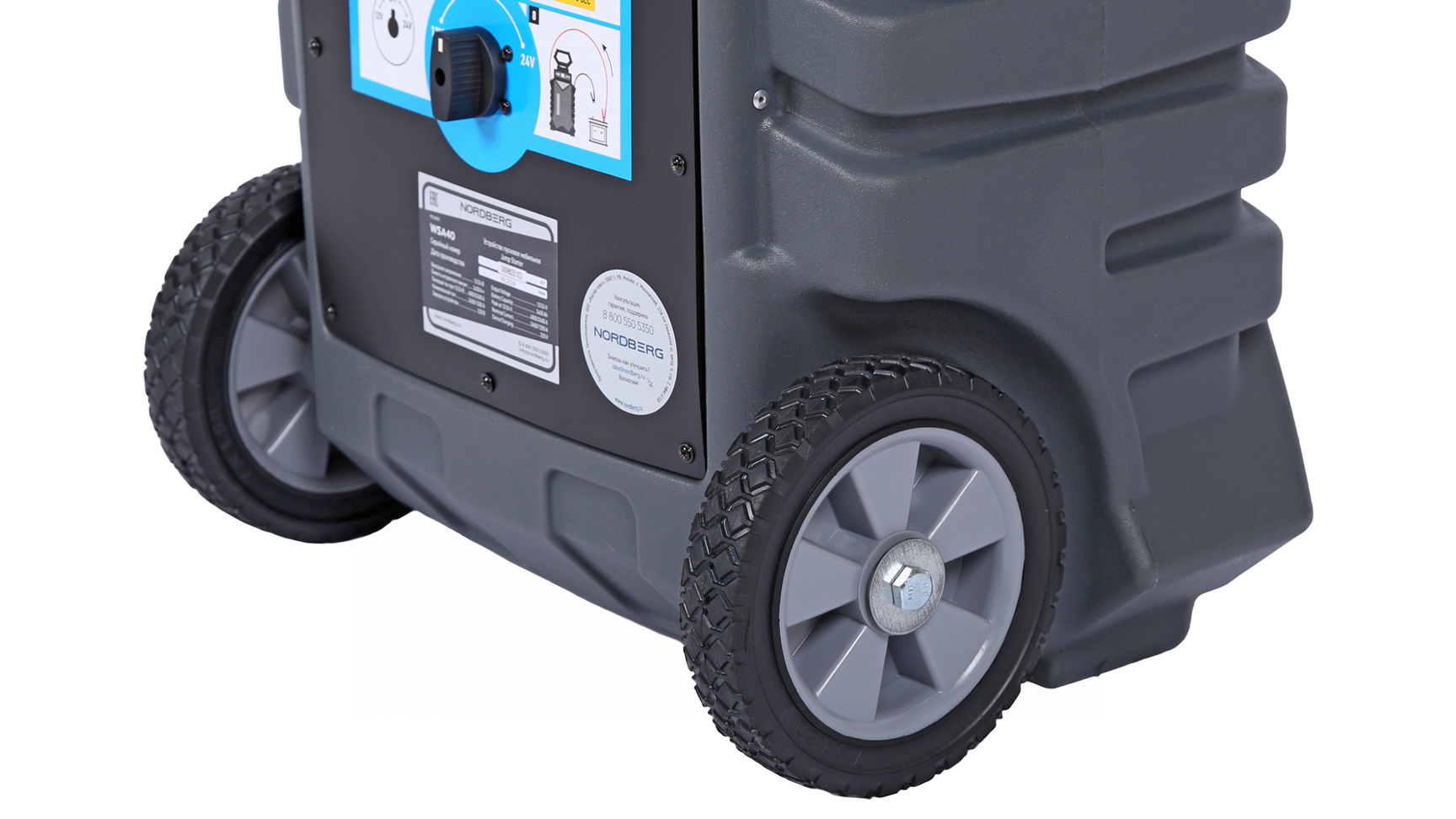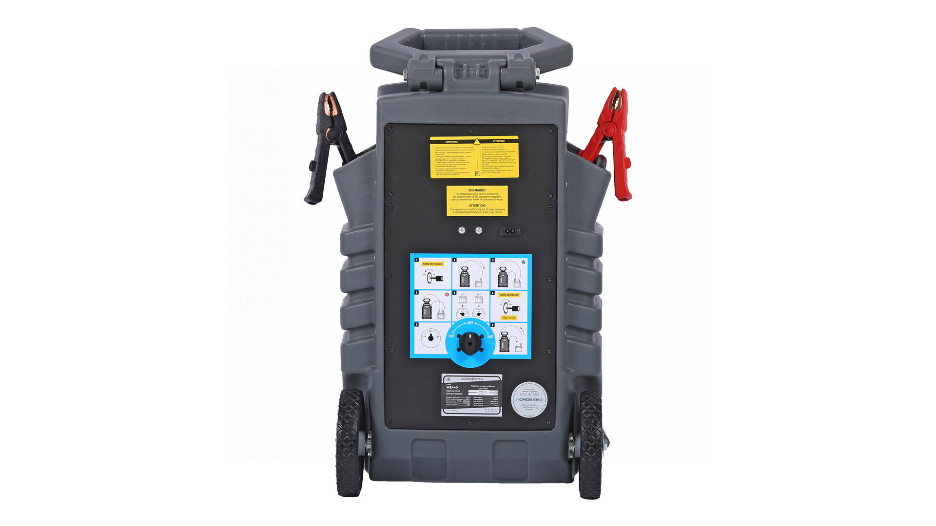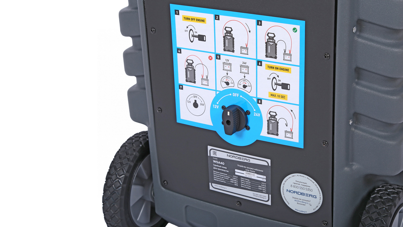 О товаре Пусковое портативное мобильное устройство NORDBERG WSA40 – компактная модель для запуска бензиновых и дизельных двигателей, а также зарядки аккумуляторных батарей. ФУНКЦИОНАЛ Устройство предназначено для быстрого запуска двигателей транспортных средств с аккумуляторной батареей 12 В или 24 В в условиях, когда аккумулятор транспортного средства разряжен. Бустер также используется для зарядки телефонов, планшетов и видеокамер и др. устройств, напряжение ЗУ которых, составляет 12 В. ПРЕИМУЩЕСТВА И ОСОБЕННОСТИ Совместим со всеми типами свинцово-кислотных аккумуляторов: STD-CA, WET, MF, EFB, GEL, AGM Максимальный пусковой ток 1200/2400 А, пиковый ток 2400А/4800А 2 розетки по 12 В для подключения периферийных устройств Емкость встроенной AGM батареи 2х28 А·ч Может работать при температуре окружающего воздуха до -40 °С Медные провода с сечением 50 мм² обладают высокой пропускной способностью Цифровой мультиметр, срабатывающий при включении устройства УДОБСТВО ИСПОЛЬЗОВАНИЯ Эргономичная ручка и колесики для транспортировки Звуковая и световая сигнализация о режимах работы КОМПЛЕКТАЦИЯ пусковое устройство NORDBERG WSA40 кабель с двумя штекерами для розетки 12 В кабель питания паспорт-инструкция Бустер NORDBERG WSA40 – универсальное устройство, позволяющее в кратчайшие сроки как запустить различные двигатели, так и зарядить мобильные устройства. Показать полностью Скрыть Характеристики Емкость встроенного аккумулятора, А·ч 56 Максимальный пусковой ток, А 4800 Напряжение заряда, В 12/24 Вес товара, кг 36 **Габариты и вес товара с упаковкой Общий вес с упаковкой - 36.5 кг Упаковка Размеры упаковки (Д*Ш*В), мм Вес, кг Упаковка №1 530 x 385 x 840 36.5 ** Теоретический вес