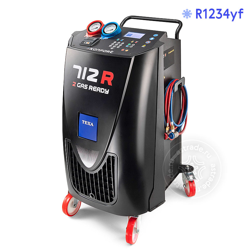 TEXA KONFORT 712R для R1234yf – автоматическая установка для заправки и обслуживания автомобильных кондиционеров, обладающая производительностью насоса – 100 л/мин, которая предназначена для откачивания хладагента, рециркуляции, вакуумирования и заправки газа в кондиционерные системы легковых автомобилей и грузовиков.